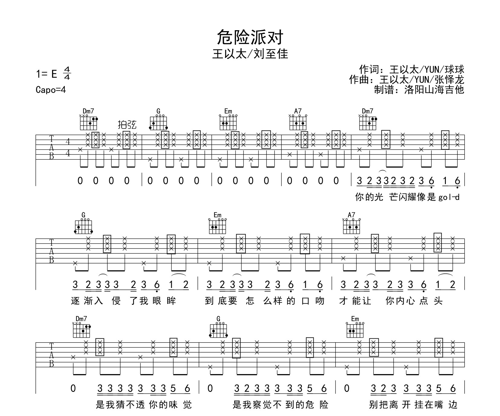 曲谱介绍: 《危险派对》吉他谱,王以太/刘至佳演唱,《危险派对》吉他弹唱谱,选用C调指法,原调E调,节奏4/4拍,弹唱难度初级简单,易上手,本吉他谱由洛阳山海吉他制谱分享,共有3张高清图片谱例。