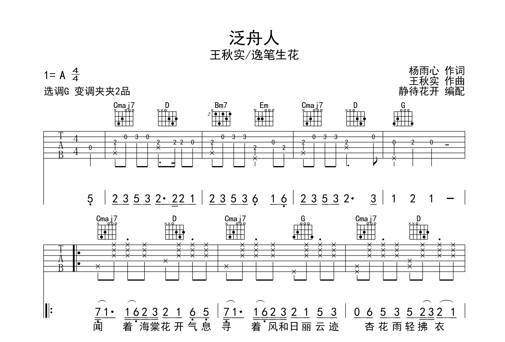曲谱介绍: 泛舟人吉他谱,王秋实/逸笔生花吉他谱,《泛舟人》吉他弹唱谱,来自@静待花开编配扒谱制作,本吉他谱采用G调和弦指法编配,推荐变调夹夹第2品演奏,原调A调,也可以根据个人嗓音条件灵活选择变调夹位置,演奏的速度控制在每分钟75拍左右,演奏难度简单。