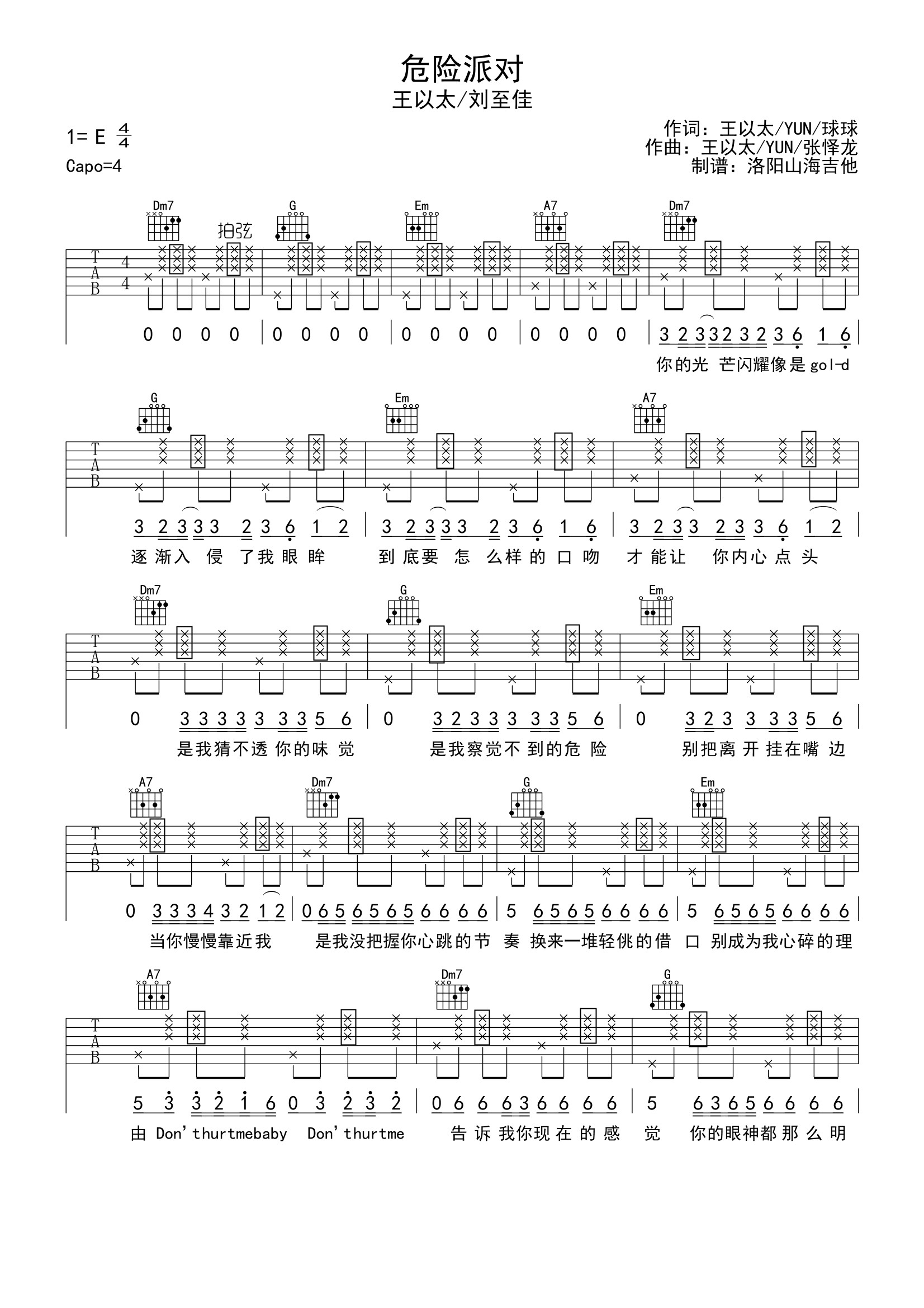 曲谱介绍: 危险派对吉他谱,王以太/刘至佳演唱的一首节奏感超强的歌曲,《危险派对》吉他弹唱谱,原调E,Capo夹四品,完整编配共三张图片谱例。 歌曲勾勒爱情萌动瞬间,双方目光聚焦,心跳失控的暧昧场景。朗朗上口的旋律,搭配闪火独特的性感腔调,带领听众抵达到芳心萌动的地带。