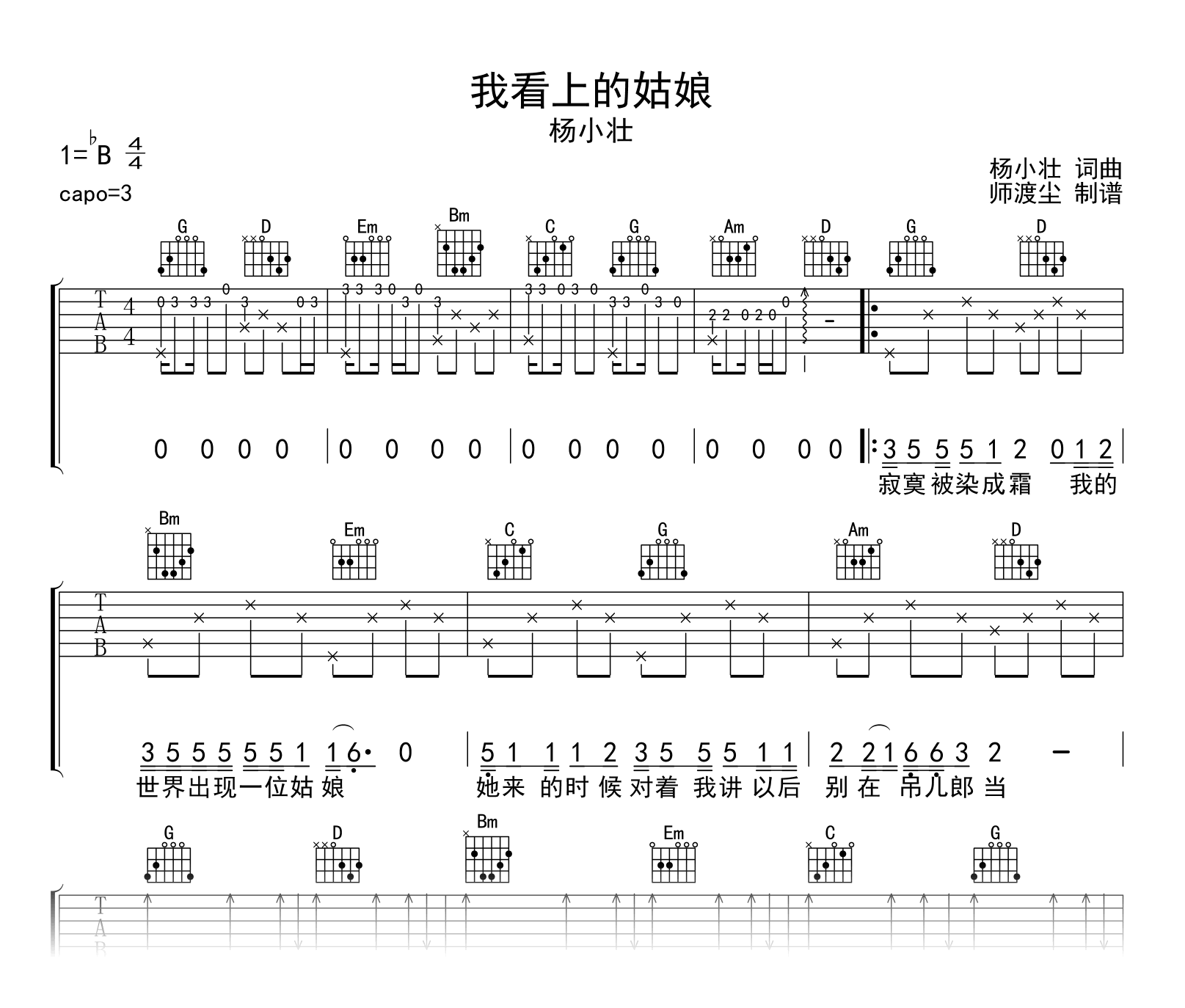 曲谱介绍: 我看上的姑娘吉他谱,杨小壮演唱,编配扒谱采用G调和弦指法,CAPO变调夹第三品,原调降B调,选择变调夹位置,演奏的速度控制在每分钟85拍左右,演奏难度三级。