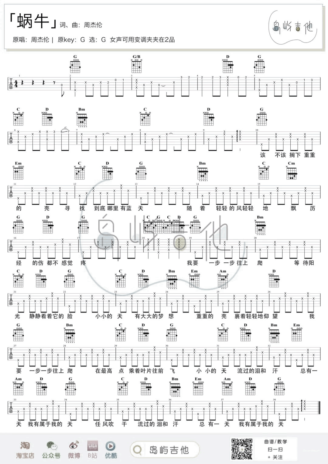 曲谱介绍: 吉他教学视频: 蜗牛吉他谱,周杰伦经典治愈励志歌曲,《蜗牛》吉他弹唱演示+教学视频,曲谱原调G选用G调,女生可以使用变调夹夹二品。琴友们跟随尼克猫老师的讲解示范练习。 歌声给人满满的力量陪伴鼓励我们前进,如果你为了梦想坚持不下去了,不妨听听这首歌,找到一点继续前进的力量~像歌词里小小的蜗牛一样,一步一步往上爬,一定会有属于你的天空。