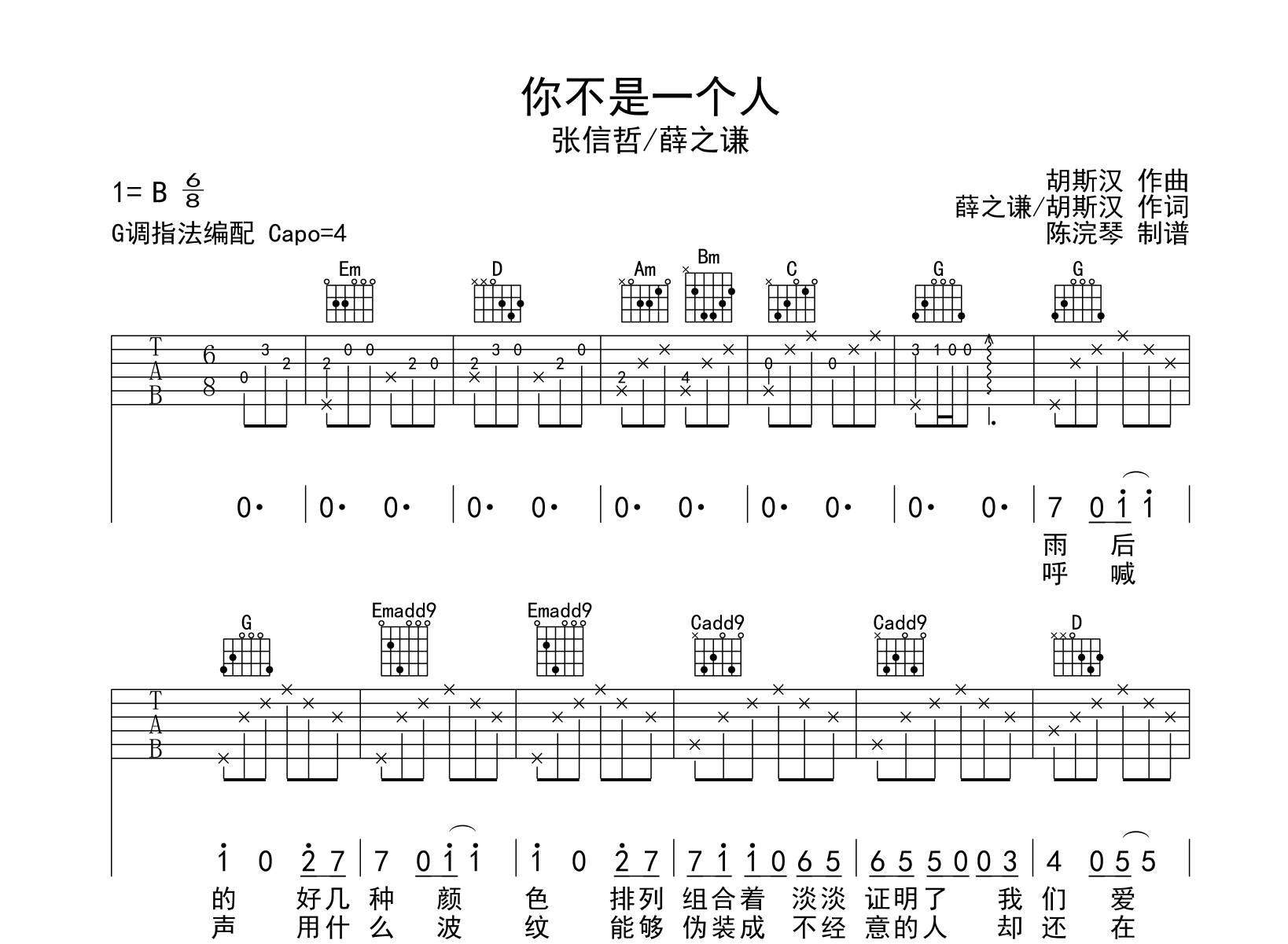 曲谱介绍: 你不是一个人吉他谱,张信哲薛之谦演唱,《你不是一个人》吉他弹唱谱,选用G调编配弹唱六线谱,夹4品弹唱原调B调,节奏6/8拍,弹唱难度较简单,本吉他谱由陈浣琴制谱分享,共有2张图片谱。