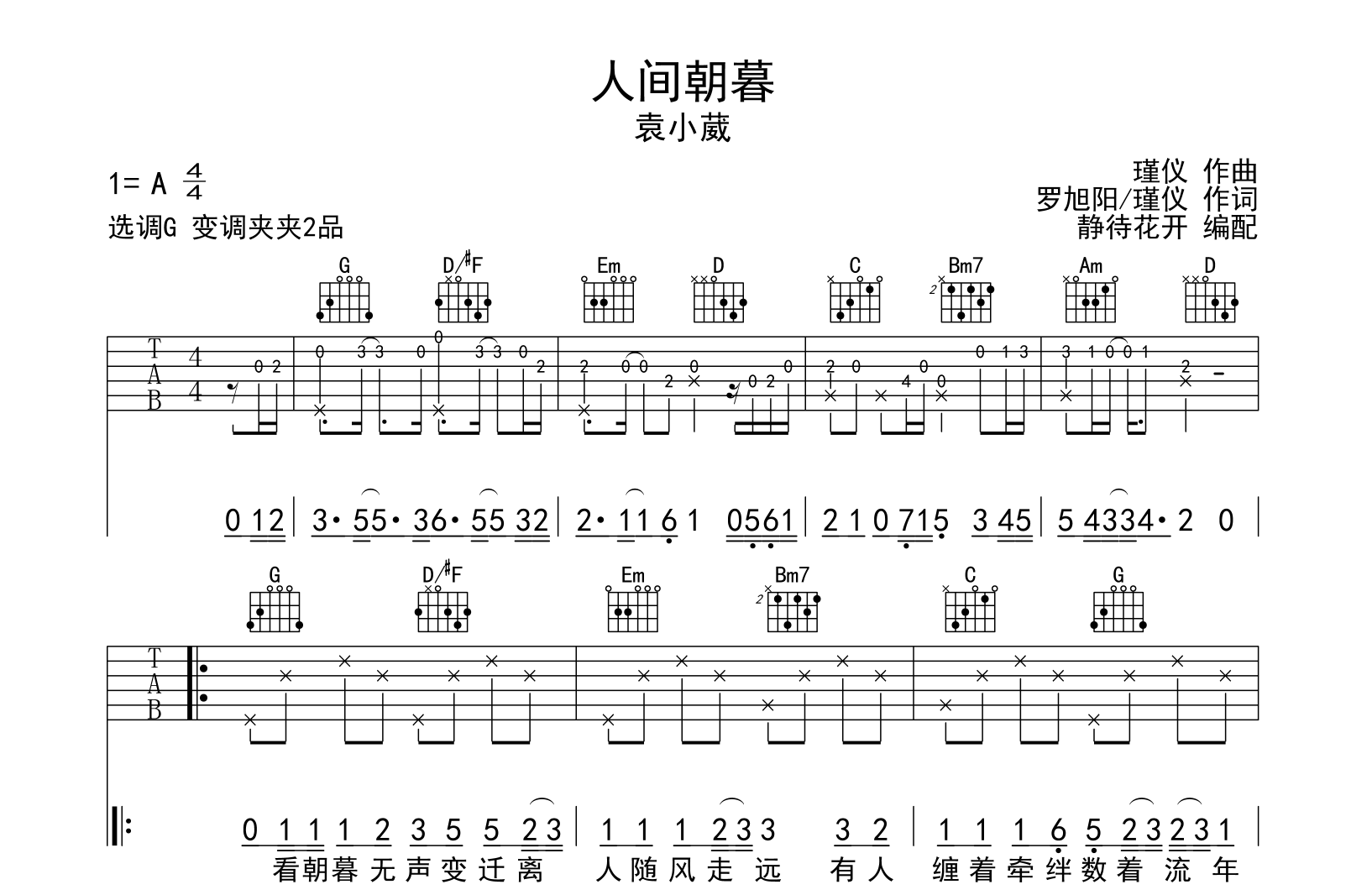 曲谱介绍: 《人间朝暮》吉他谱,袁小葳演唱,《人间朝暮》吉他弹唱谱,来自@静待花开编配扒谱制作,本吉他谱采用G调和弦指法编配,推荐变调夹夹第2品演奏,原调A调,也可以根据个人嗓音条件灵活选择变调夹位置,演奏的速度控制在每分钟80拍左右,演奏难度简单。