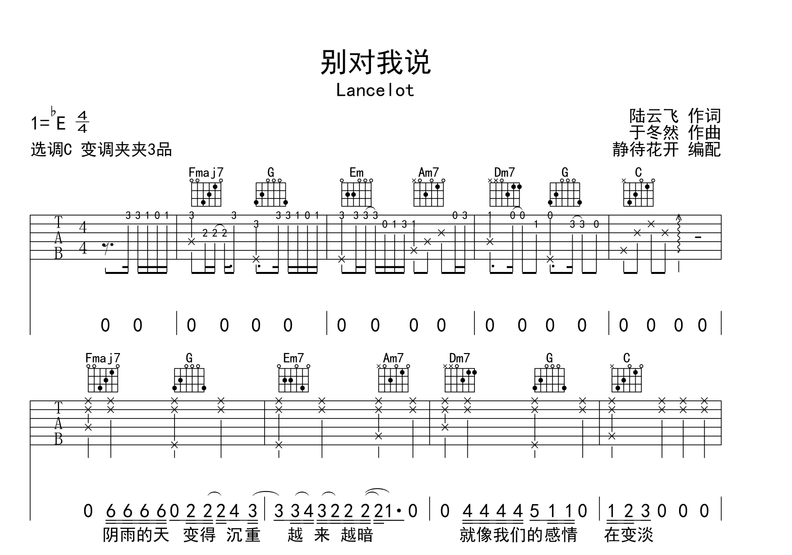 曲谱介绍: 《别对我说》吉他谱,Lancelot演唱,《别对我说》吉他弹唱谱,来自@静待花开编配扒谱制作,本吉他谱采用C调和弦指法编配,推荐变调夹夹第3品演奏,原调bE调,也可以根据个人嗓音条件灵活选择变调夹位置,演奏的速度控制在每分钟86拍左右,演奏难度简单。