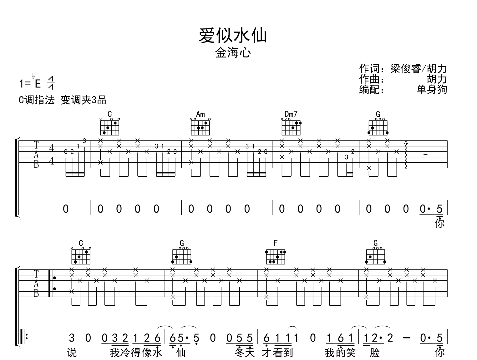 曲谱介绍: 《爱似水仙》吉他谱,金海心演唱,《爱似水仙》吉他弹唱谱,来自@单身狗编配扒谱制作,本吉他谱采用C调和弦指法编配,推荐变调夹夹第3品演奏,原调bE调,也可以根据个人嗓音条件灵活选择变调夹位置,演奏难度简单,共有3张高清六线谱图例。