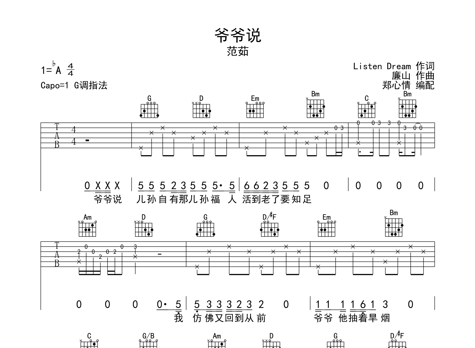 曲谱介绍: 《爷爷说》吉他谱,范茹演唱,《爷爷说》吉他弹唱谱,本吉他谱采用G调和弦指法编配,原调为降A调,变调夹夹第1品演奏,也可以根据个人音域选择变调夹位置,演奏的速度可控制在每分钟65拍左右,由郑心情扒谱编配,共有3张高清图片谱例。