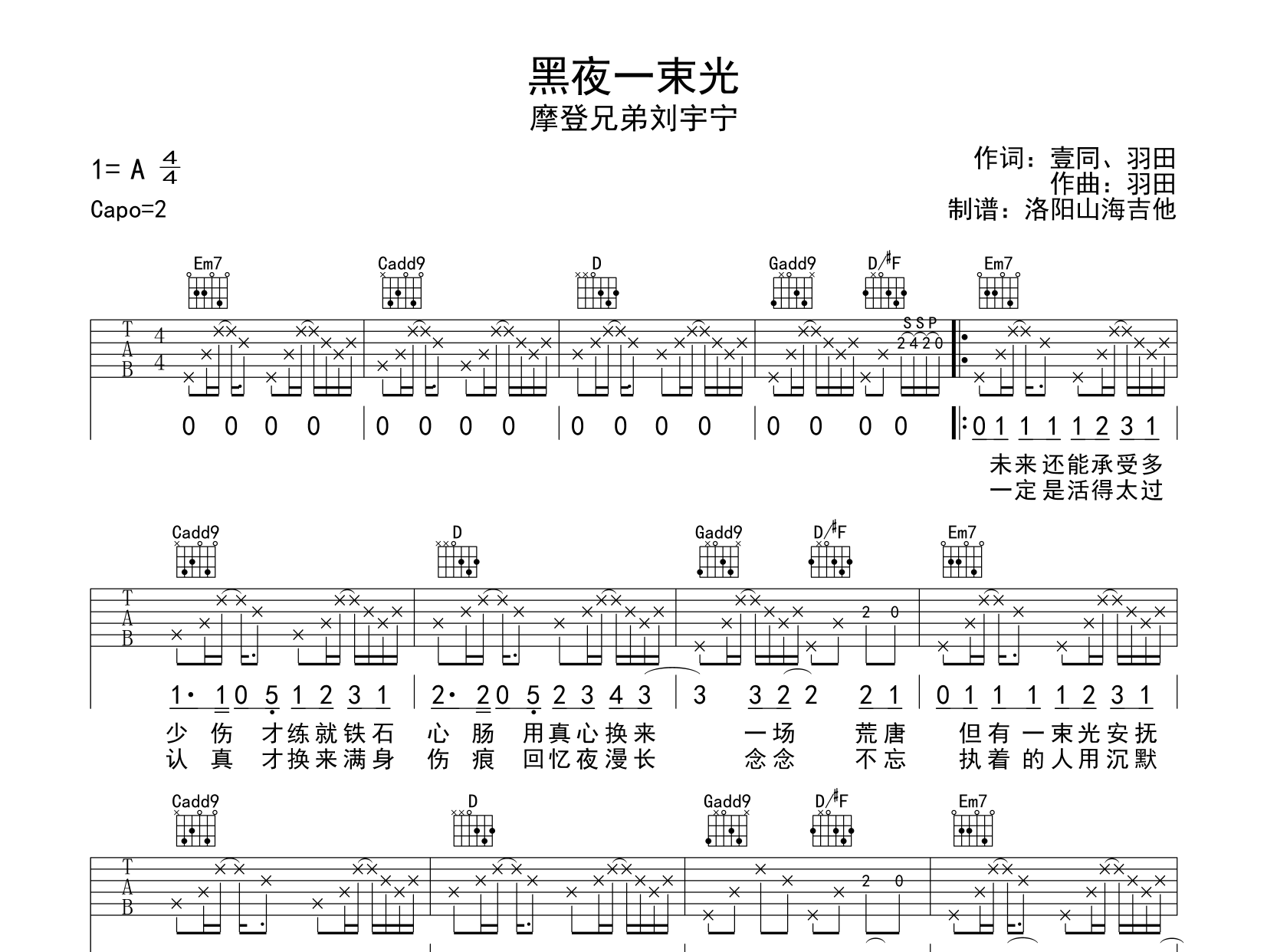 曲谱介绍: 《黑夜一束光》吉他谱,摩登兄弟刘宇宁演唱,《黑夜一束光》吉他弹唱谱,选用G调指法,原调A调,CAPO夹2品弹唱原调,本吉他谱由洛阳山海吉他扒谱编配,总共有2张高清图片谱例,喜欢的朋友可以试弹一下哦。