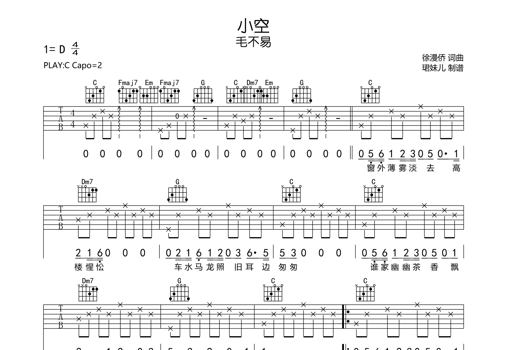 曲谱介绍: 小空吉他谱,毛不易演唱,《小空》吉他弹唱谱,本谱采用C调指法编配,原调D调,弹唱建议变调夹2品,速度85BPM,节奏4/4拍,难度较简单,易上手,由珺妹儿制谱分享,共2张高清图片谱。