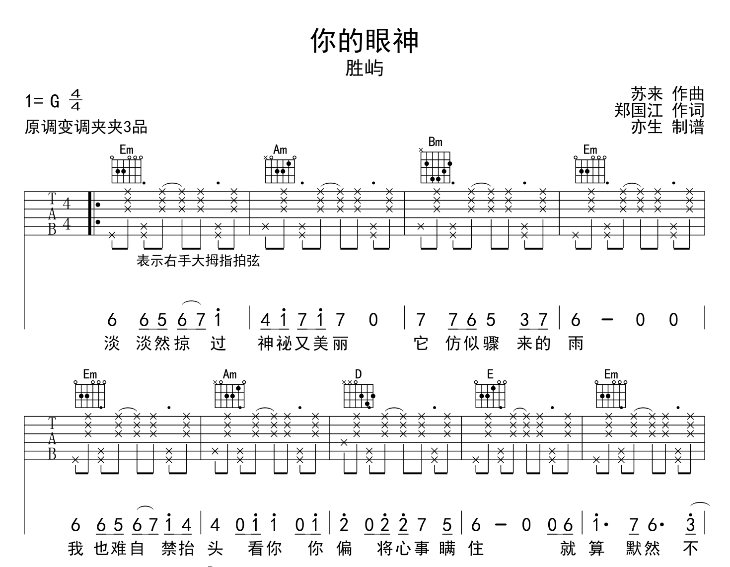 曲谱介绍: 你的眼神吉他谱,胜屿演唱的一首粤语歌曲,《你的眼神》吉他弹唱谱,本吉他谱谱采用G调指法,节奏4/4拍,速度95BPM,变调夹夹3品,难度简单,由亦生制谱分享,共有2张高清图片谱。