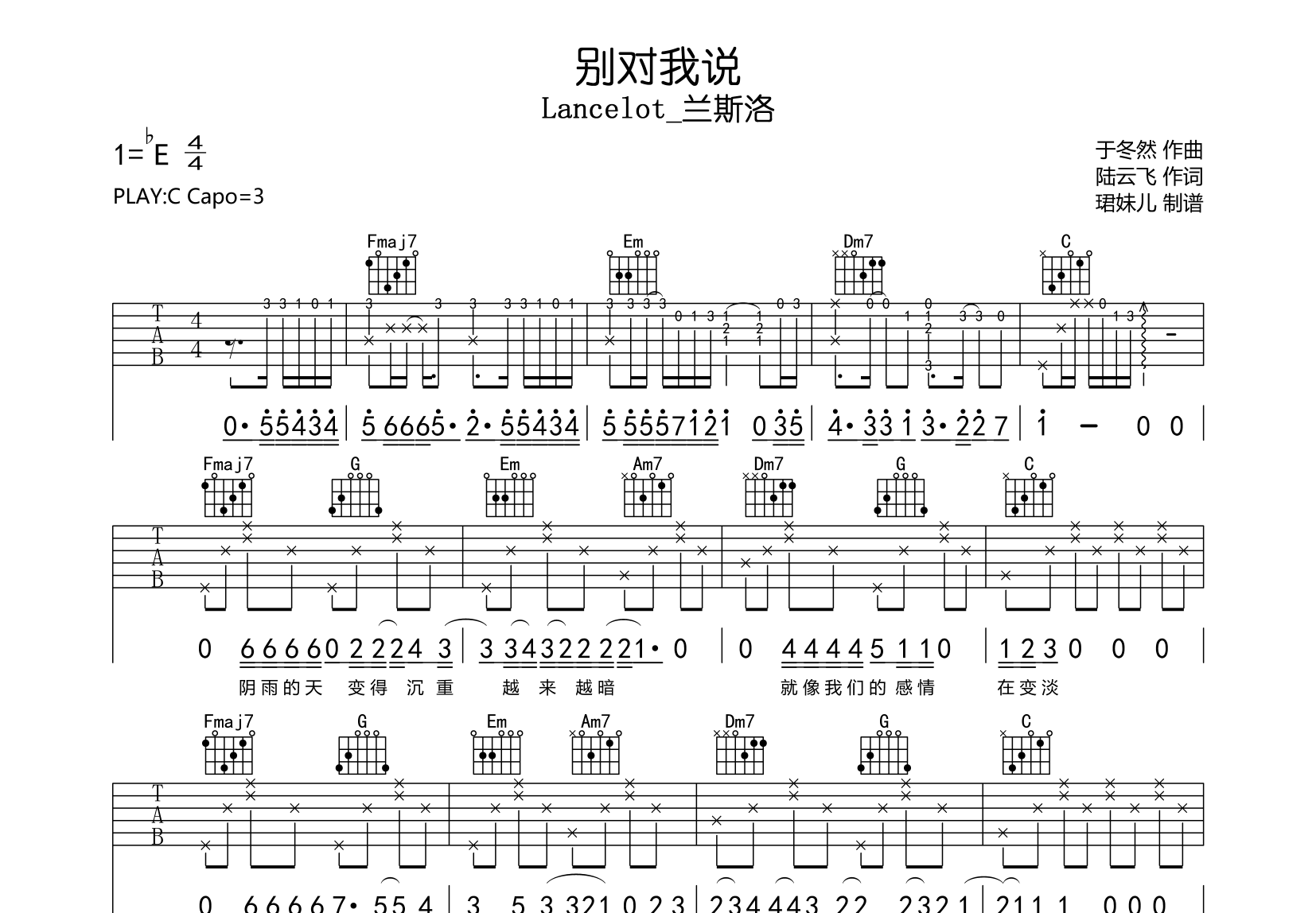 曲谱介绍: 别对我说吉他谱,Lancelot_兰斯洛演唱,《别对我说》吉他弹唱谱,本谱采用C调指法编配,弹唱建议变调夹3品,速度85BPM,节奏4/4拍,难度较简单,易上手,共有2张高清图片谱,由珺妹儿制谱分享。