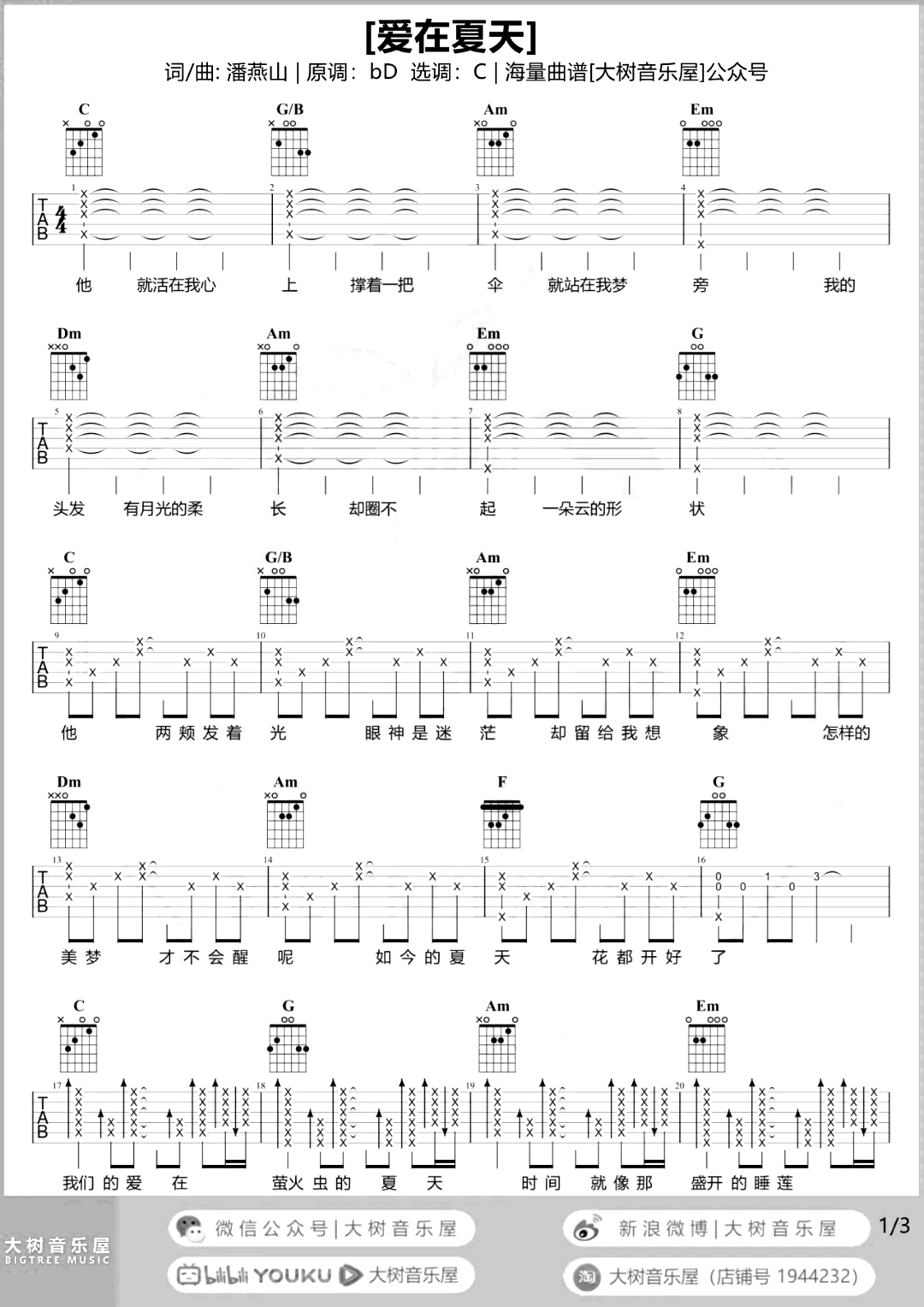 曲谱介绍: 爱在夏天吉他谱,告五人的一首歌曲,慵懒的嗓音流入耳中,恰似清凉的夏风,沁人心扉。《爱在夏天》吉他弹唱教学视频,琴友们参照示范讲解学习。原调升C调,选用C调指法,变调夹夹一品,共三张图片六线谱。