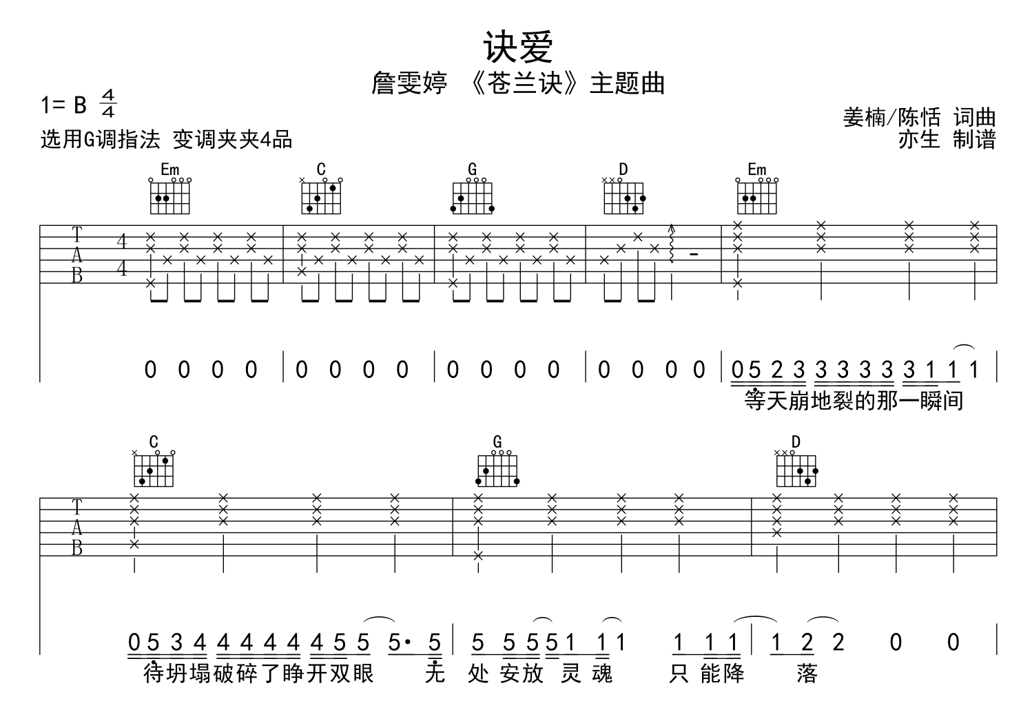 曲谱介绍: 诀爱吉他谱,前FIR主场詹雯婷演唱的《苍兰诀》主题曲,《诀爱》吉他弹唱谱,由亦生扒谱编配制谱,本吉他谱采用G调指法,节奏4/4拍,速度95,变调夹夹4品,难度简单,共有2张高清图片谱。