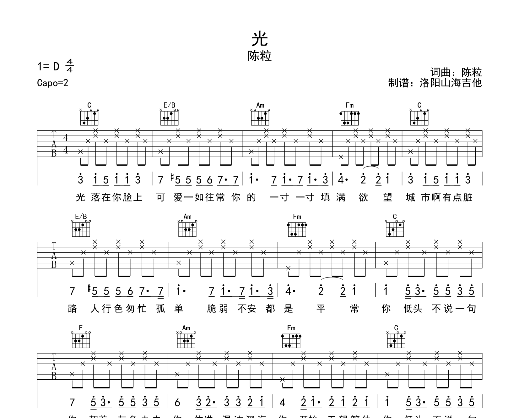 曲谱介绍: 《光》吉他谱,陈粒演唱,《光》吉他弹唱谱,来自@洛阳山海吉他编配扒谱制作,本吉他谱采用C调和弦指法编配,推荐变调夹夹第2品演奏,原调D调,也可以根据个人嗓音条件灵活选择变调夹位置,演奏难度简单,共有2张高清六线谱图例。
