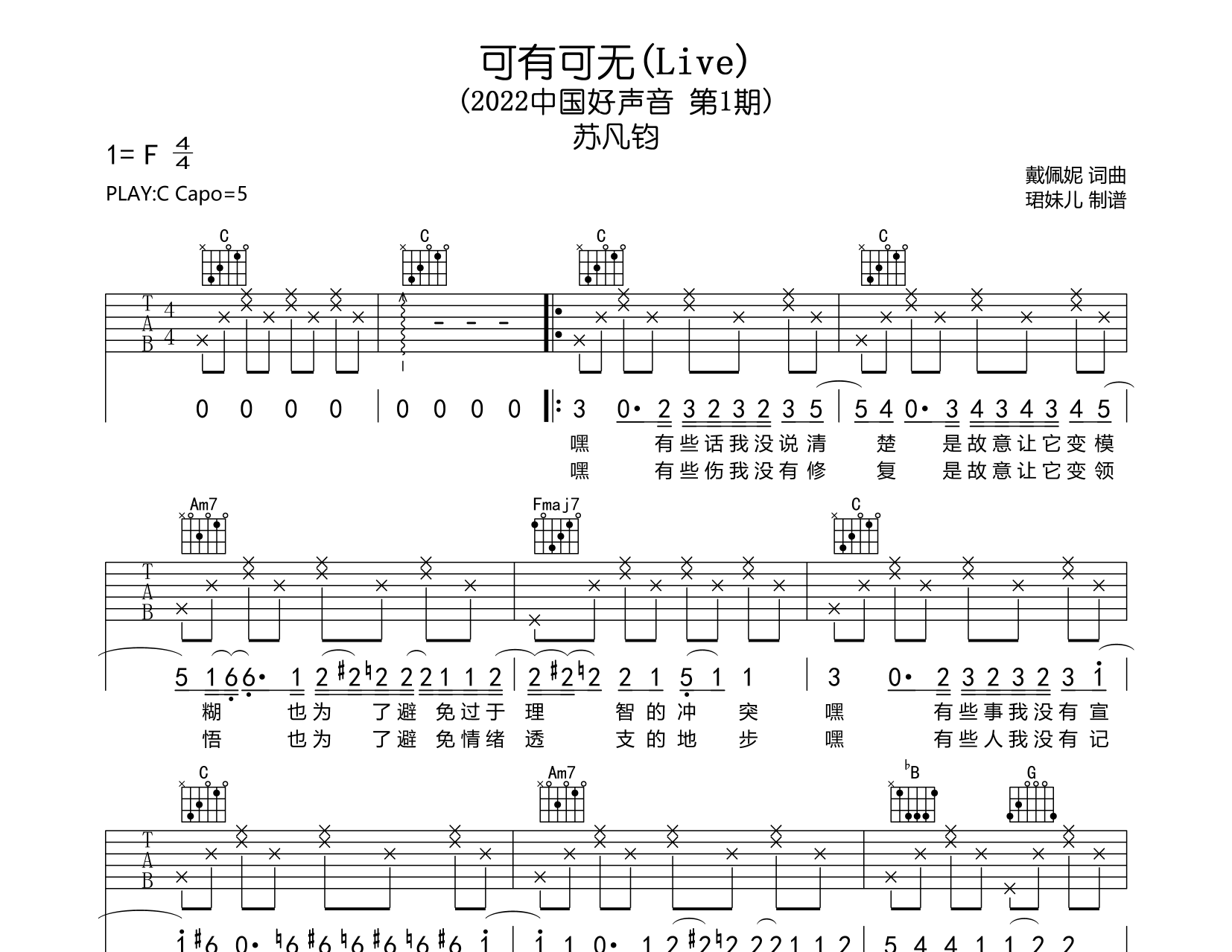 曲谱介绍: 可有可无(Live)吉他谱,苏凡钧演唱,《可有可无(Live)》吉他弹唱谱,本谱采用C调指法编配,弹唱建议变调夹5品,速度85BPM,节奏4/4拍,难度较简单,易上手,由珺妹儿制谱,共3张高清图片谱。