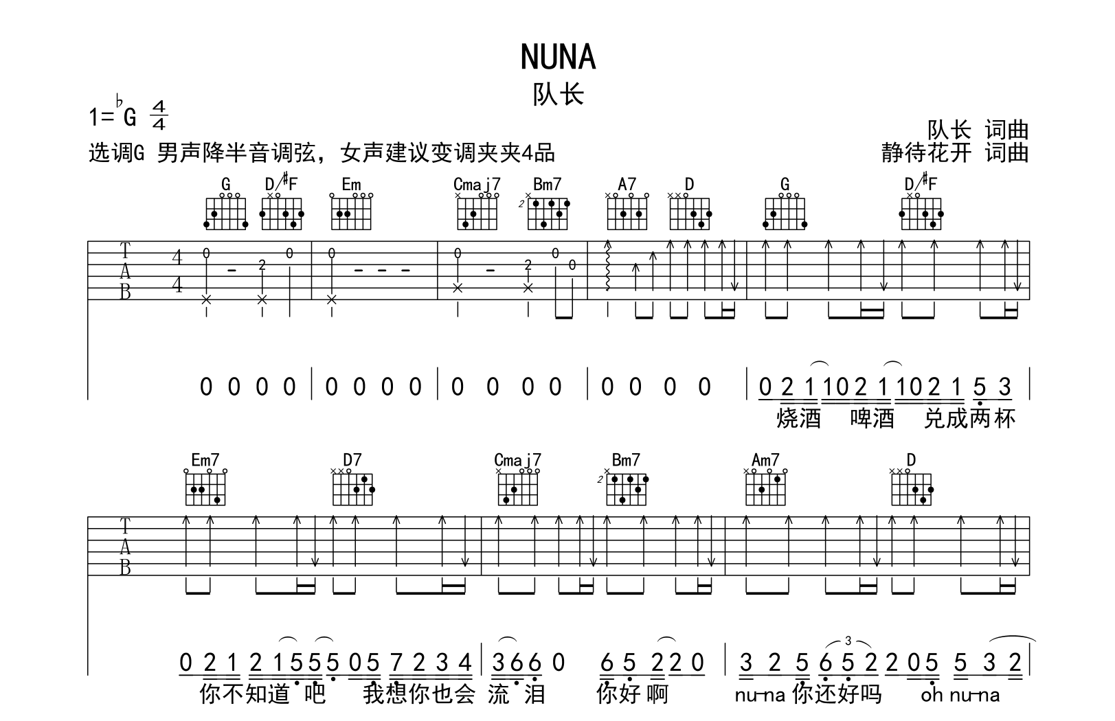 曲谱介绍: 《NUNA》吉他谱,队长演唱,《NUNA》吉他弹唱谱,来自@静待花开编配扒谱制作,本吉他谱采用G调和弦指法编配,演奏建议男声降半音调弦,女声建议变调夹夹4品,原调bG调,也可以根据个人嗓音条件灵活选择变调夹位置,演奏的速度控制在每分钟90拍左右,演奏难度简单。