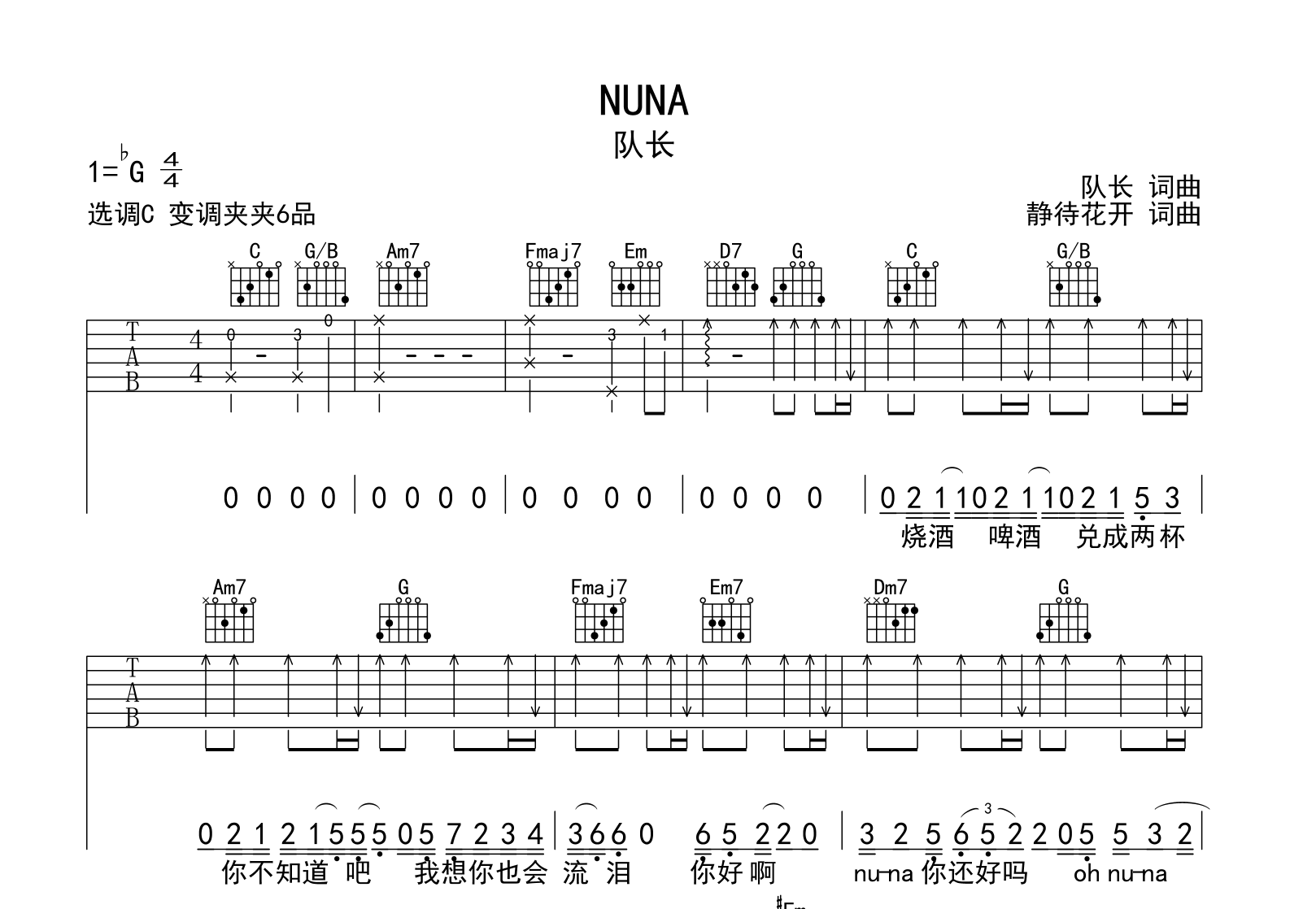 曲谱介绍: 《NUNA》吉他谱,队长演唱,《NUNA》吉他弹唱谱,来自@静待花开编配扒谱制作,本吉他谱采用C调和弦指法编配,建议变调夹夹6品弹唱,原调bG调,也可以根据个人嗓音条件灵活选择变调夹位置,演奏的速度控制在每分钟90拍左右,演奏难度简单。
