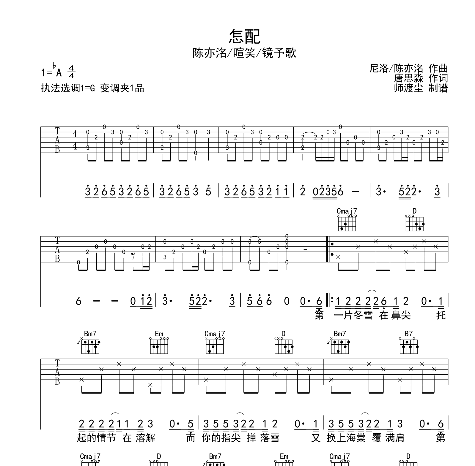 曲谱介绍: 怎配吉他谱,全网首发,来自@师渡尘编配扒谱制作,本吉他谱采用G调和弦指法编配,推荐变调夹夹第1品演奏,原调bA调,也可以根据个人嗓音条件灵活选择变调夹位置,演奏的速度控制在每分钟80拍左右,演奏难度简单。