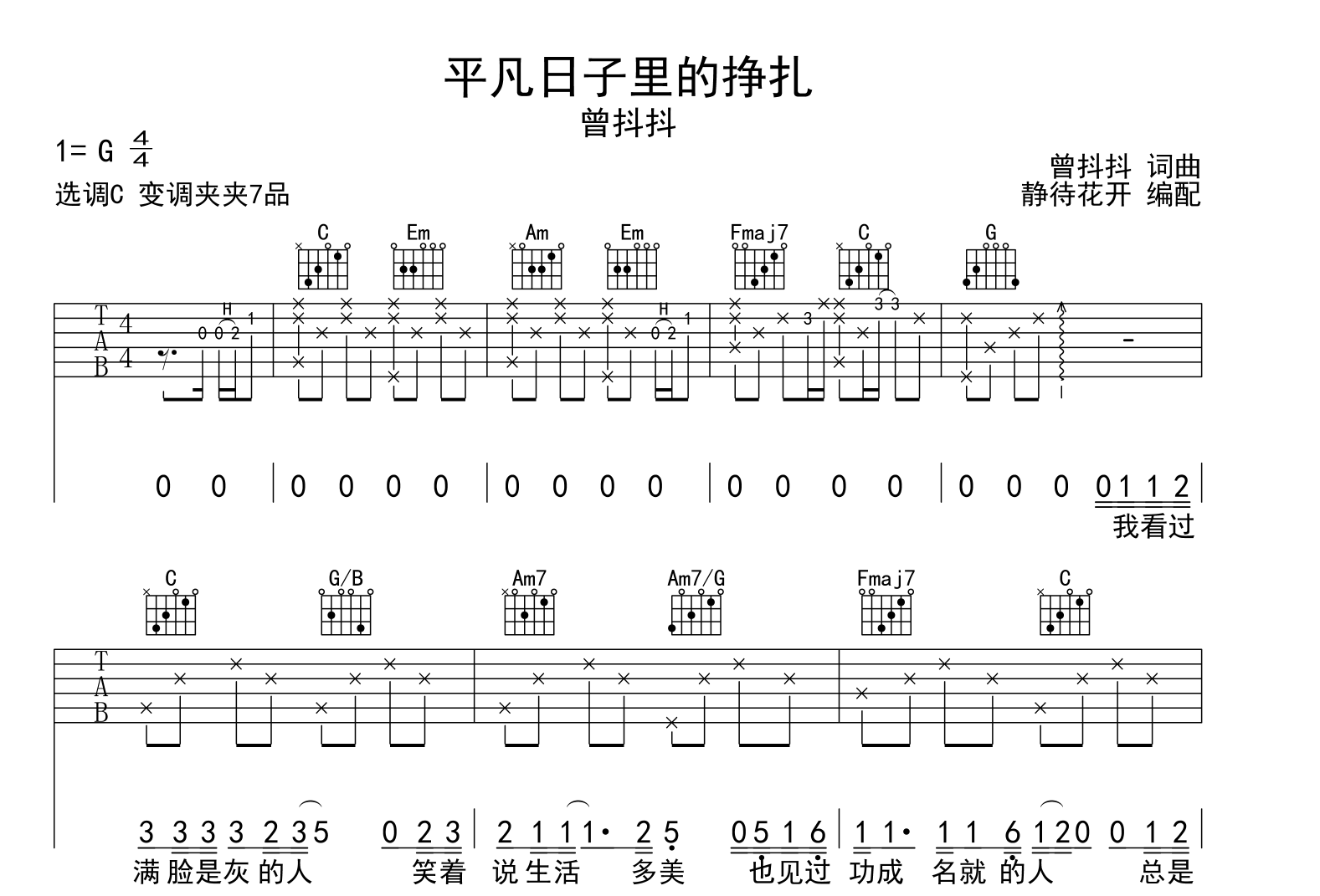 曲谱介绍: 平凡日子里的挣扎吉他谱,来自@静待花开编配扒谱制作,《平凡日子里的挣扎》吉他弹唱谱,本吉他谱采用C调和弦指法编配,推荐变调夹夹第7品演奏,原调G调,也可以根据个人嗓音条件灵活选择变调夹位置,演奏的速度控制在每分钟85拍左右,演奏难度简单。