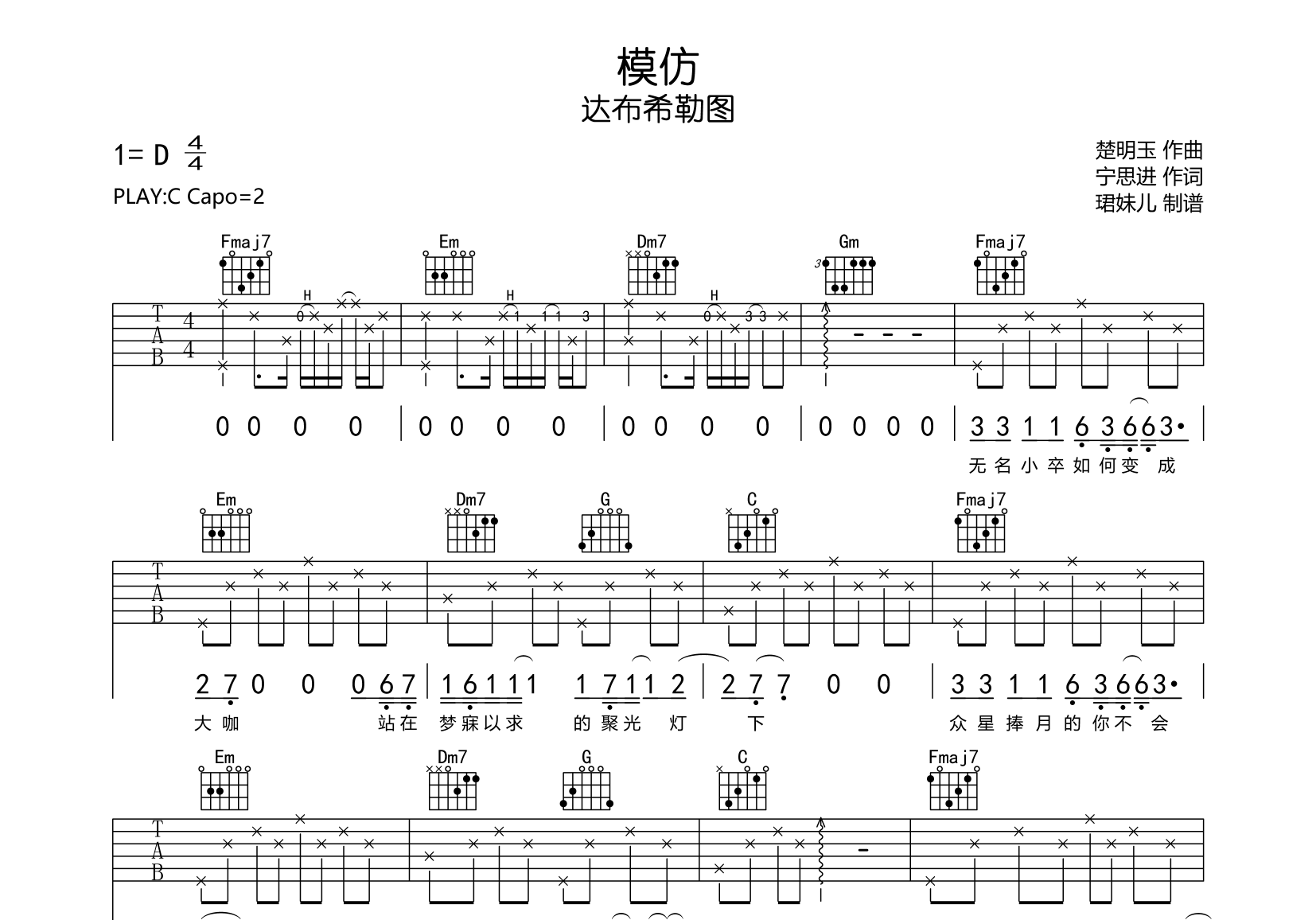 曲谱介绍: 模仿吉他谱,达布希勒图演唱,《模仿》吉他弹唱谱,本谱采用C调指法编配,弹唱建议变调夹2品,速度85BPM,节奏4/4拍,难度较简单,易上手,共有3张高清图片谱,由珺妹儿制谱分享。