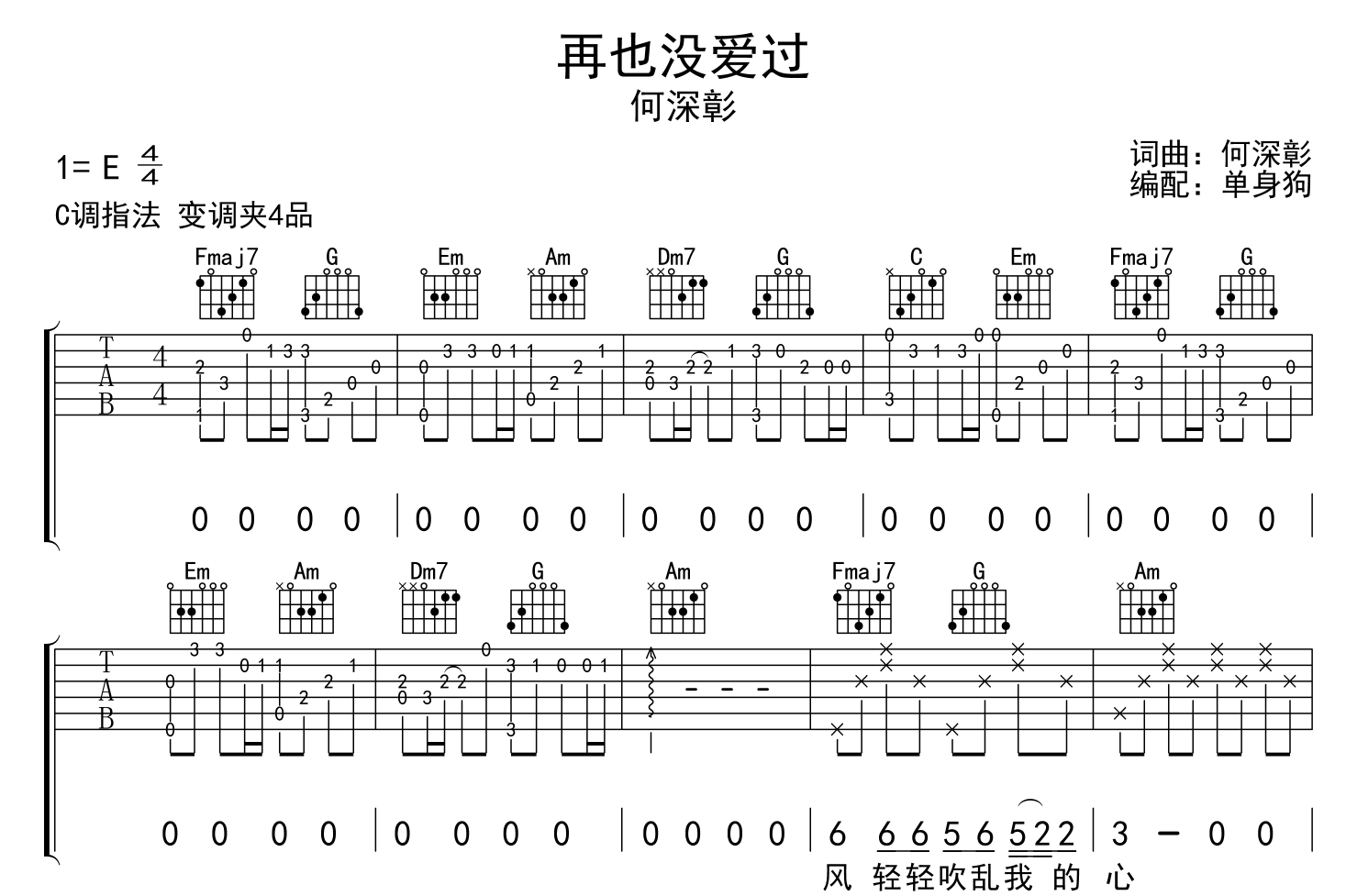 曲谱介绍: 《再也没爱过》吉他谱,何深彰演唱,《再也没爱过》吉他弹唱谱,选用C调指法,原调E调,CAPO夹4品弹唱原调,弹唱难度较简单,共有2张高清图片谱,由单身狗制谱分享。