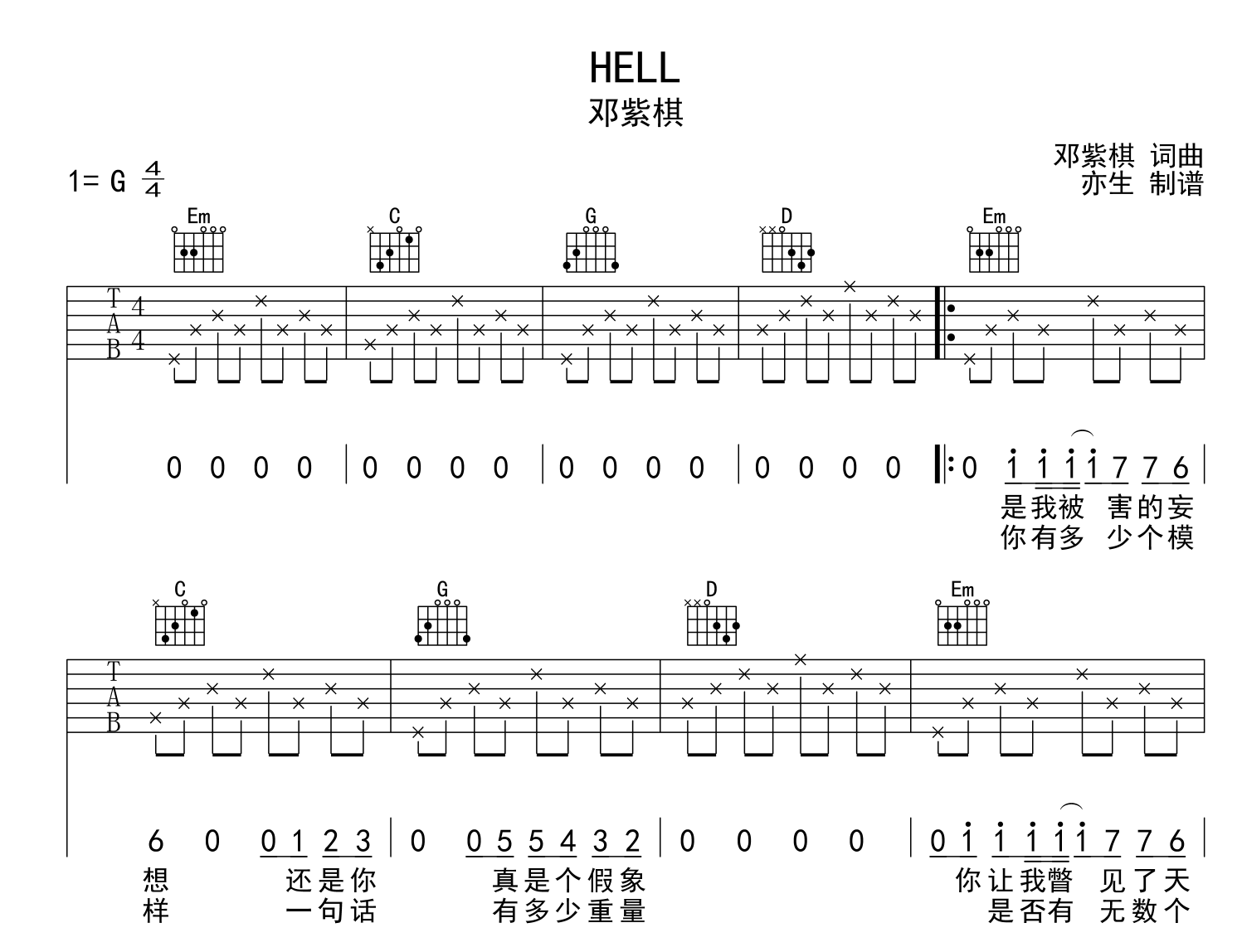 曲谱介绍: HELL吉他谱,邓紫棋演唱,《HELL》吉他弹唱谱,采用G调指法,节奏4/4拍,速度95BPM,难度简单,变调夹不夹,本谱由亦生制谱分享,共有3张高清图片谱例。