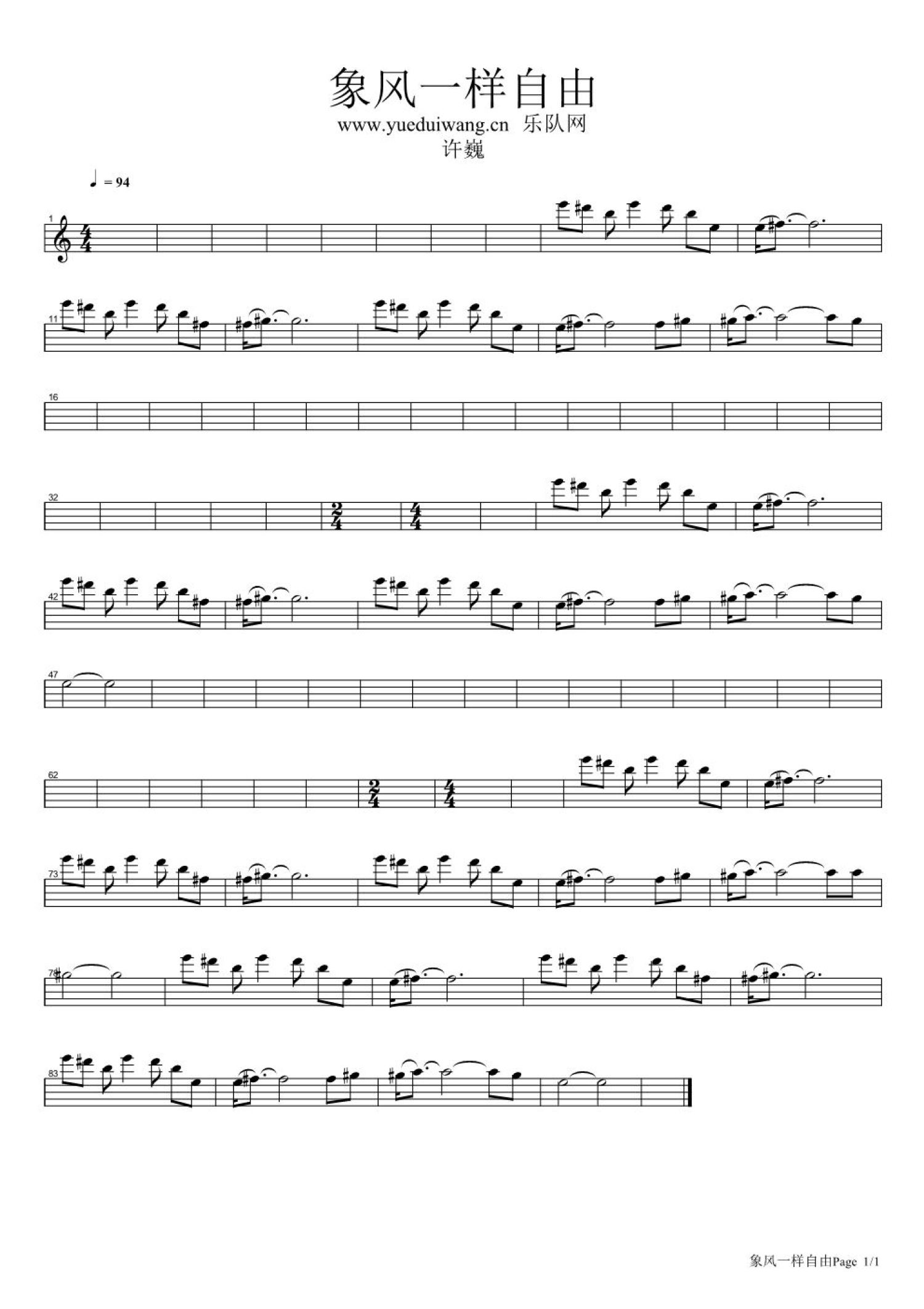 像风一样自由钢琴谱 - 许巍 - 键盘谱