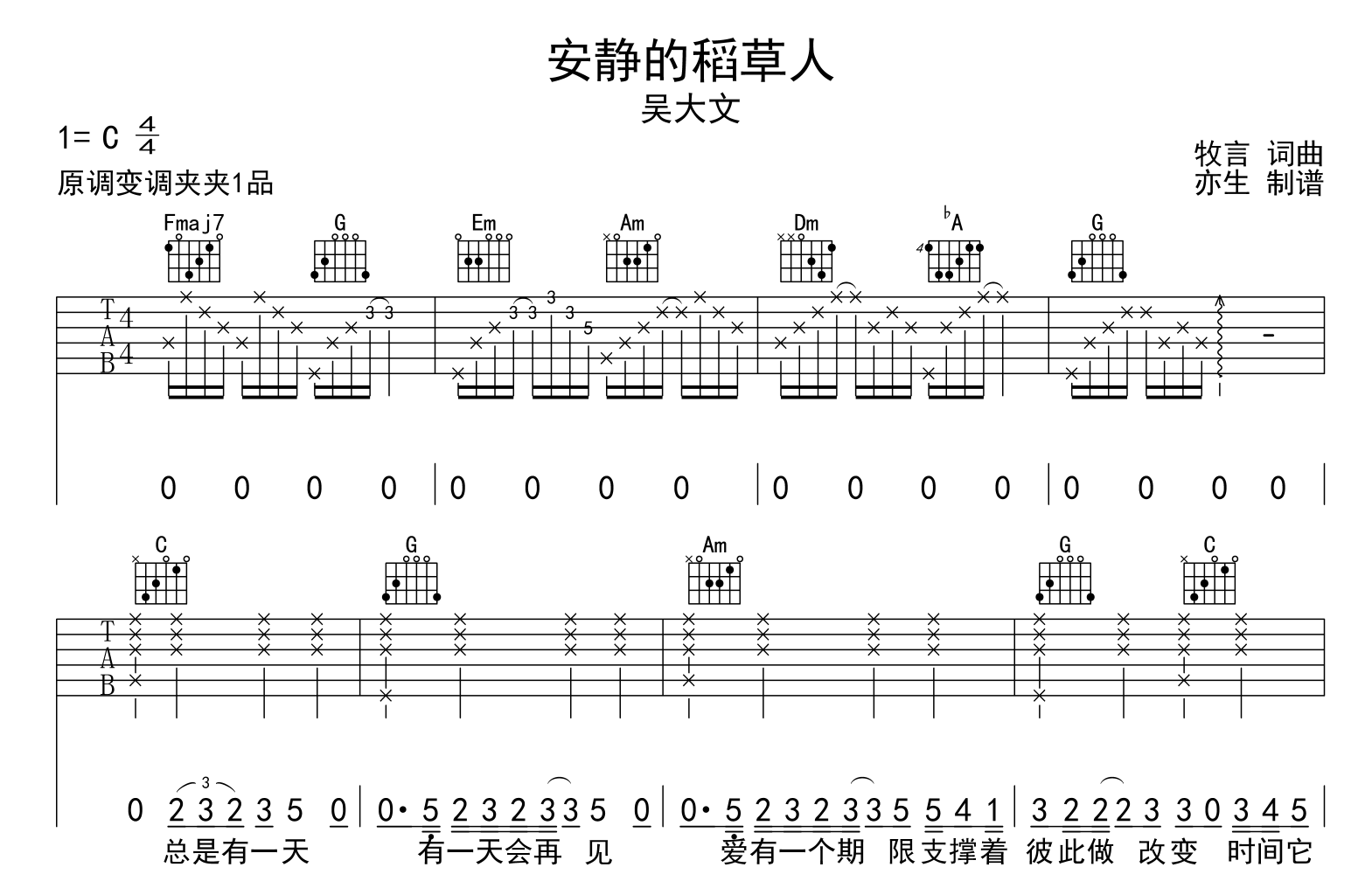 曲谱介绍: 《安静的稻草人》吉他谱,吴大文演唱,《安静的稻草人》吉他弹唱谱,本吉他谱采用C调指法,节奏4/4拍,速度95拍每分钟,变调夹夹1品,难度简单,本谱共有3张高清图片谱,由亦生制谱分享。