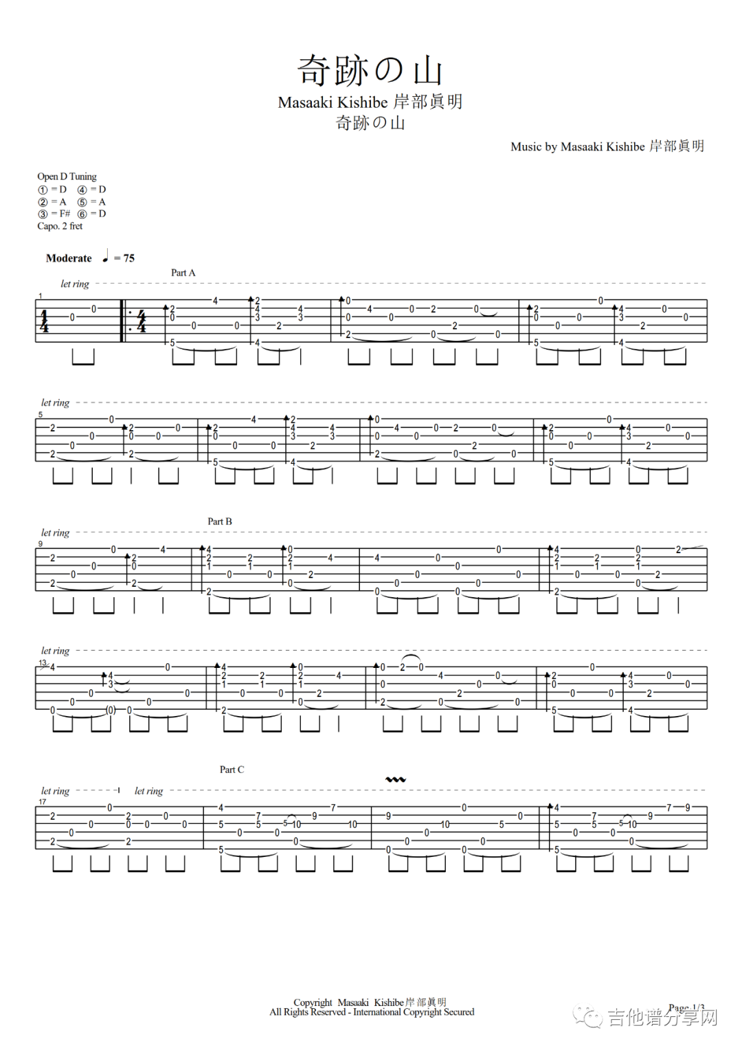 曲谱介绍: 岸部真明(Masaaki Kishibe)是日本新生代指弹吉他演奏家,日本finger-style大师Nakagawa Isato的学生。其作品风格非常的多元化,既有优美清新的吉他独奏小品,又有另类的独奏作品。他于2003年参加了National Fingerstyle Guitar Championships,并获得了第2名的好成绩,展现了其非凡的实力。
