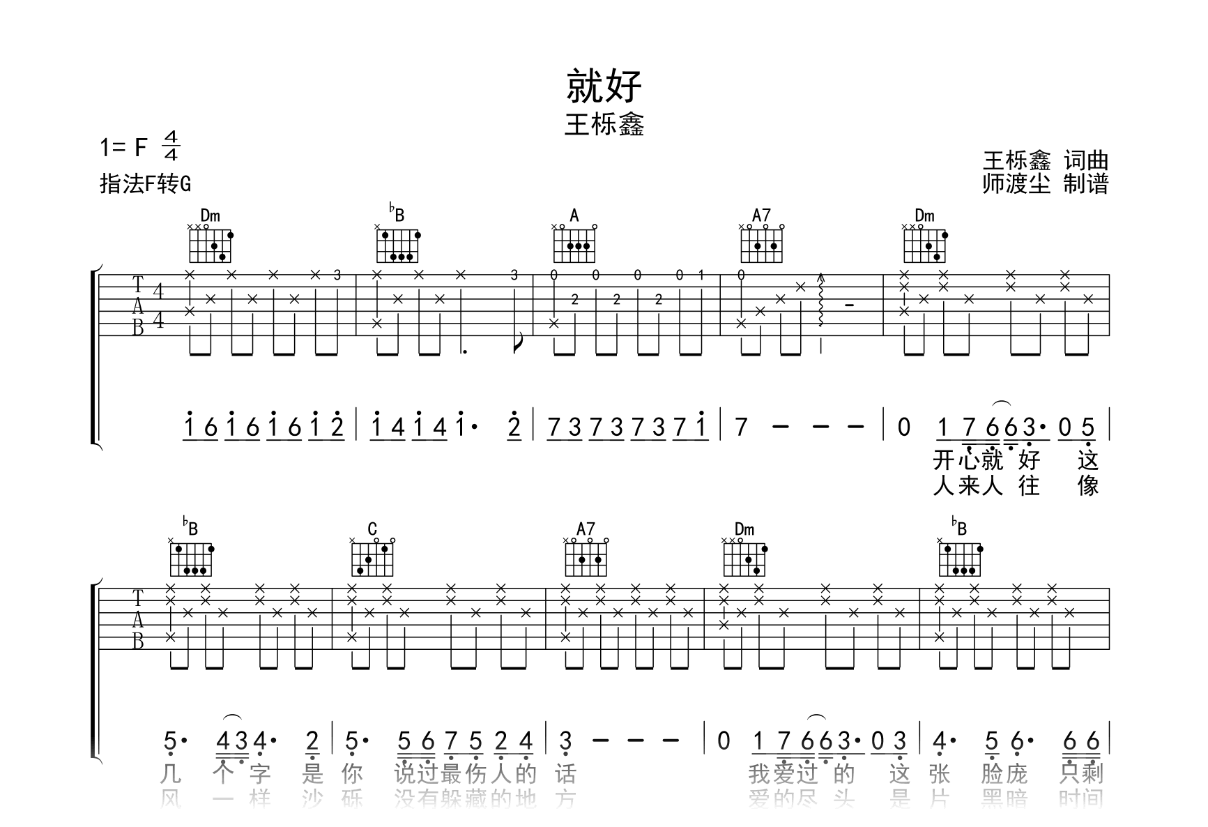 就好吉他谱 - 王栎鑫 - F调吉他弹唱谱