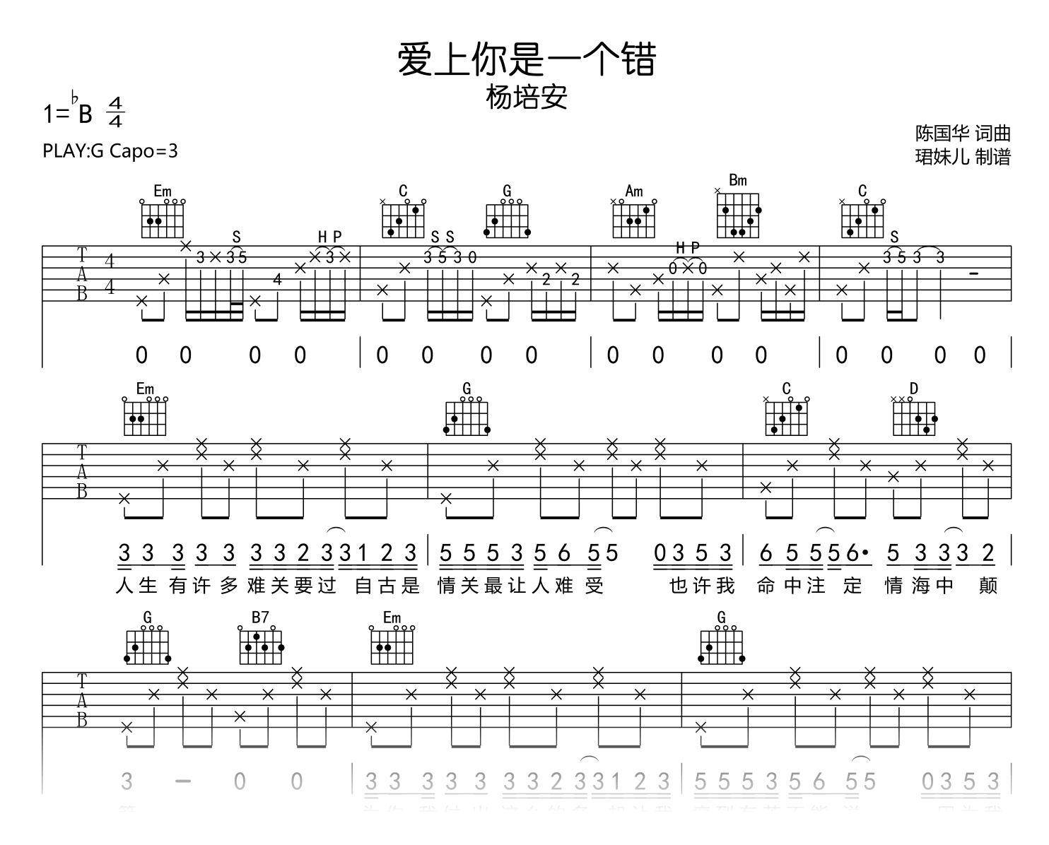曲谱介绍: 爱上你是一个错吉他谱,杨培安的一首经典歌曲,《爱上你是一个错》吉他弹唱谱,采用G调指法编配,共两张高清图片谱。变调夹3品,速度85BPM,演奏较简单易上手。 一首伤感情歌,听着让人心痛,唱尽爱情的心酸无奈。这首歌当年通过网络快速在内地广为传播,可谓是火得一塌糊涂。