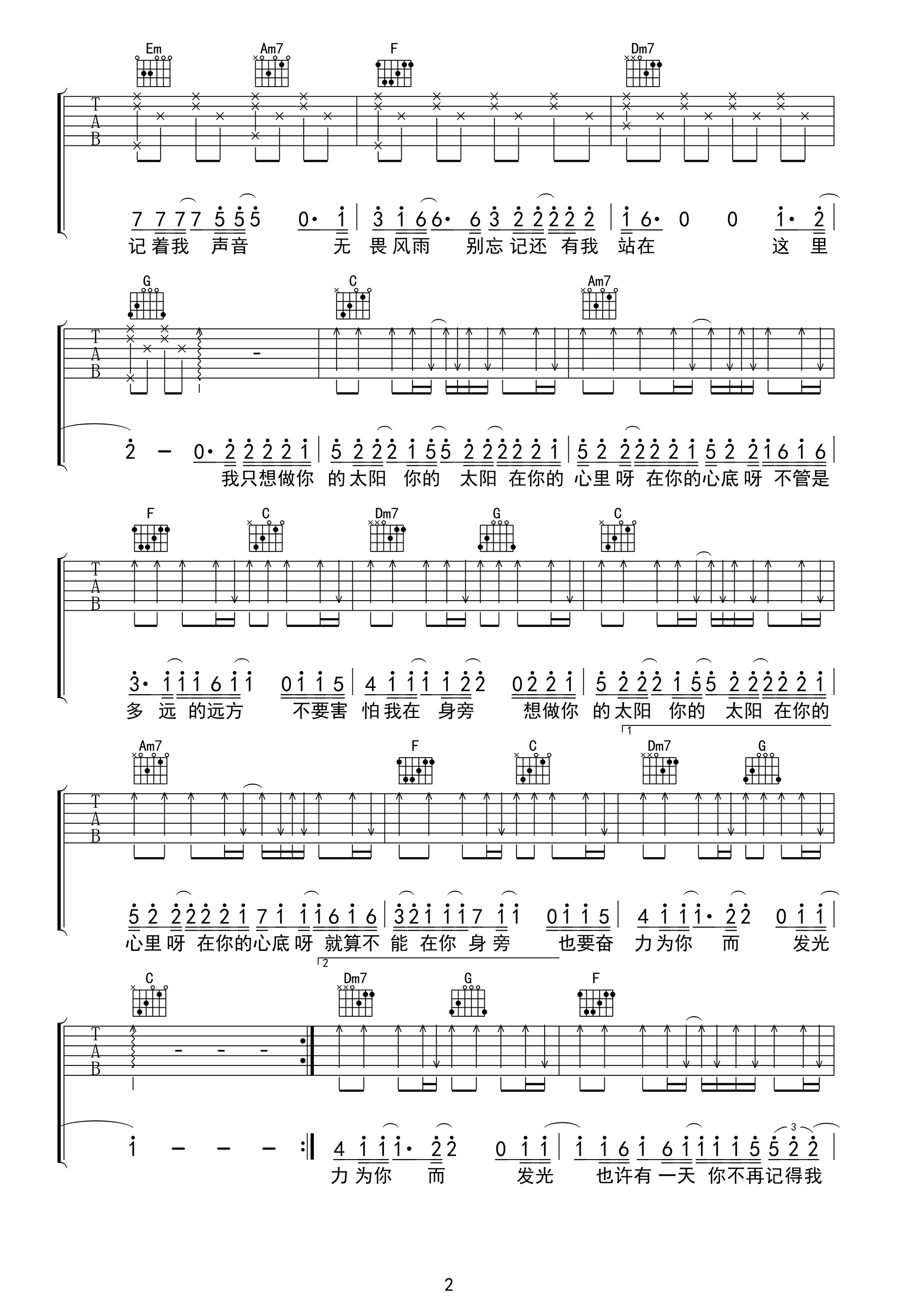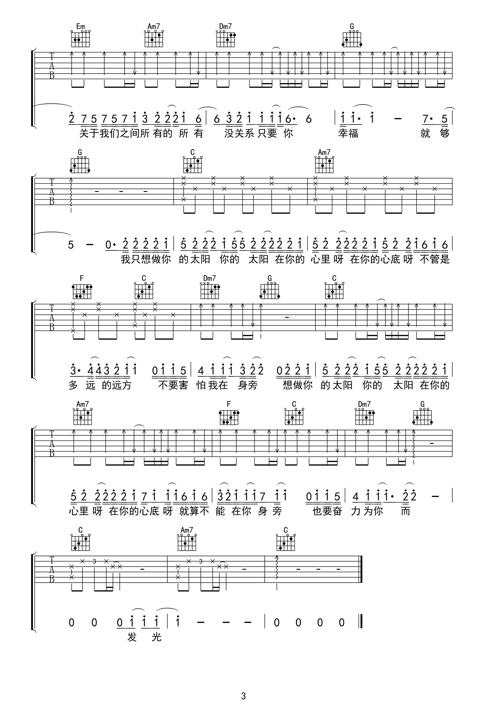 曲谱介绍: 太阳吉他谱,邱振哲演唱,一首火爆全网的励志歌曲,献给每一个默默无闻努力追梦的人。《太阳》吉他弹唱谱,原调bE,变调夹夹三品,选用C调指法,完整编配共三张高清图片六线谱。