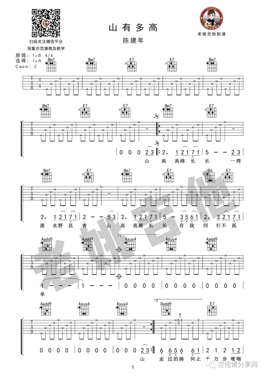 当前位置:琴谱网>吉他弹唱>山有多高 陈建年 A调