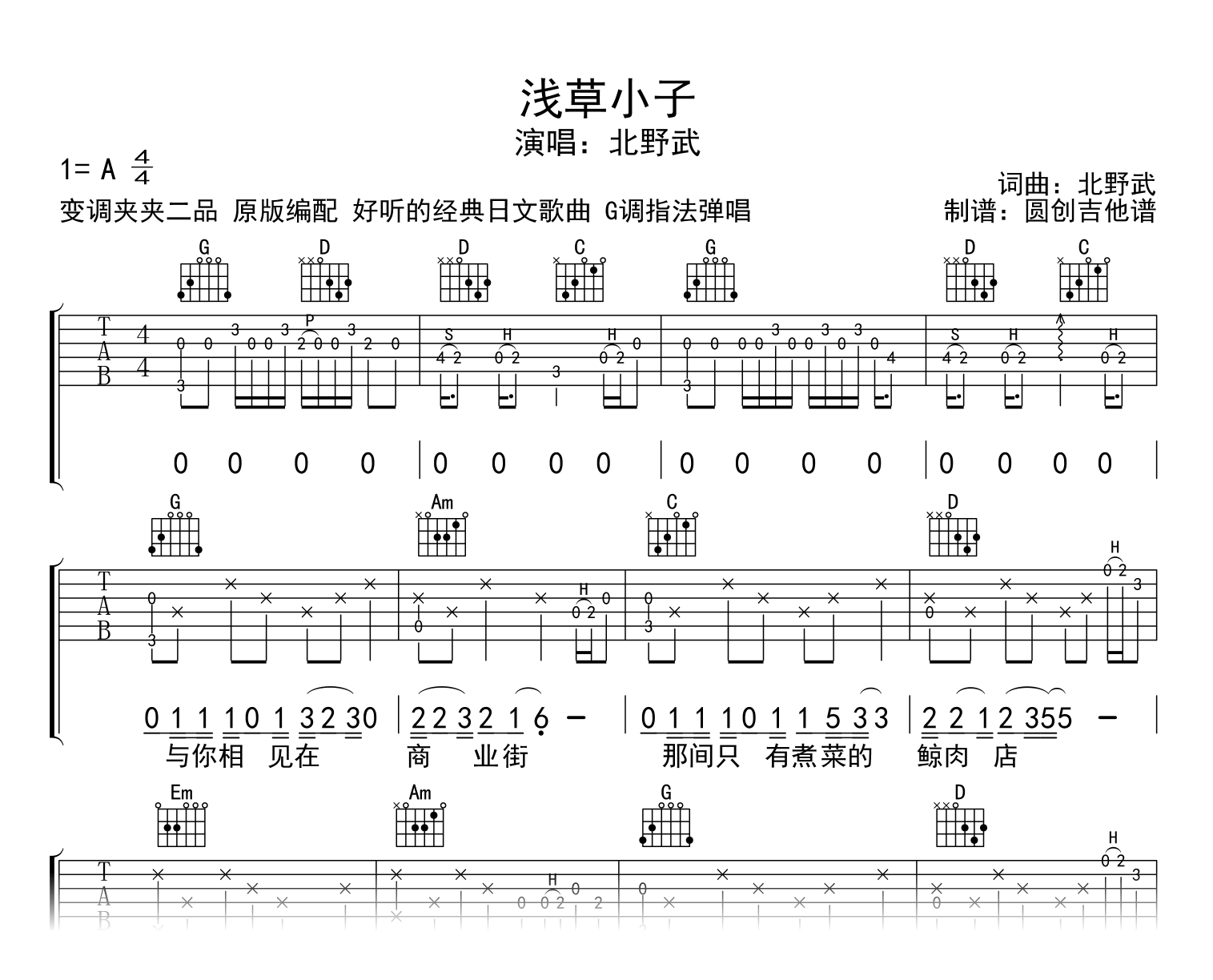 曲谱介绍: 浅草小子吉他谱,北野武演唱的一首经典日文歌,也是同名自传体电影主题曲,优美动听的旋律,即便听不懂歌词也能让人不自觉勾起怀旧的思绪。 《浅草小子》吉他弹唱谱,原调A,使用G调指法,变调夹夹二品,指法简单容易弹唱,随谱附上吉他演奏音频,琴友们可以参照示范练习。