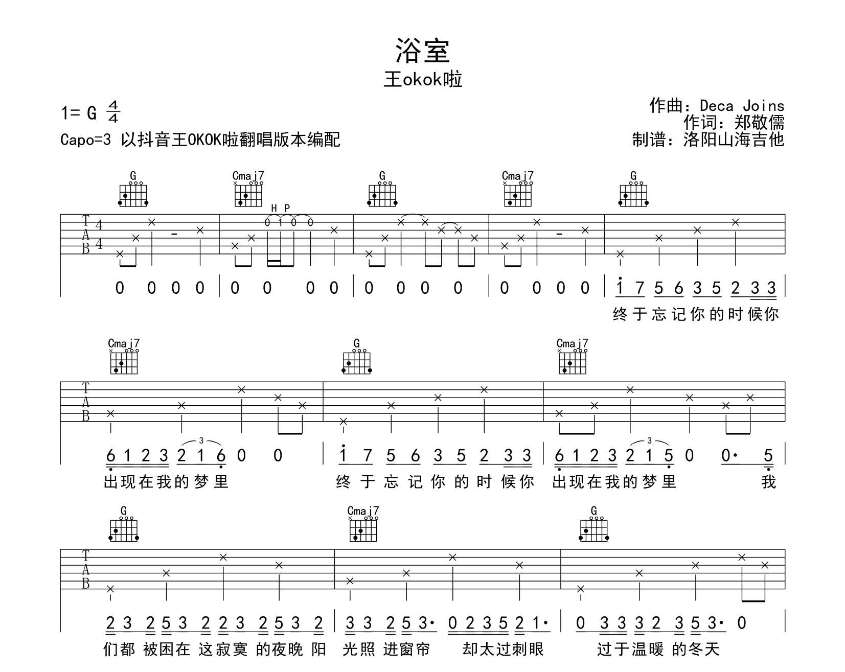 曲谱介绍: 《浴室》吉他谱,王OKOK啦演唱,《浴室》吉他弹唱谱,来自@洛阳山海吉他编配扒谱制作,本吉他谱采用G调和弦指法编配,CAPO夹3品弹唱,也可以根据个人嗓音条件灵活选择变调夹位置,演奏难度简单。共有1张图片谱。