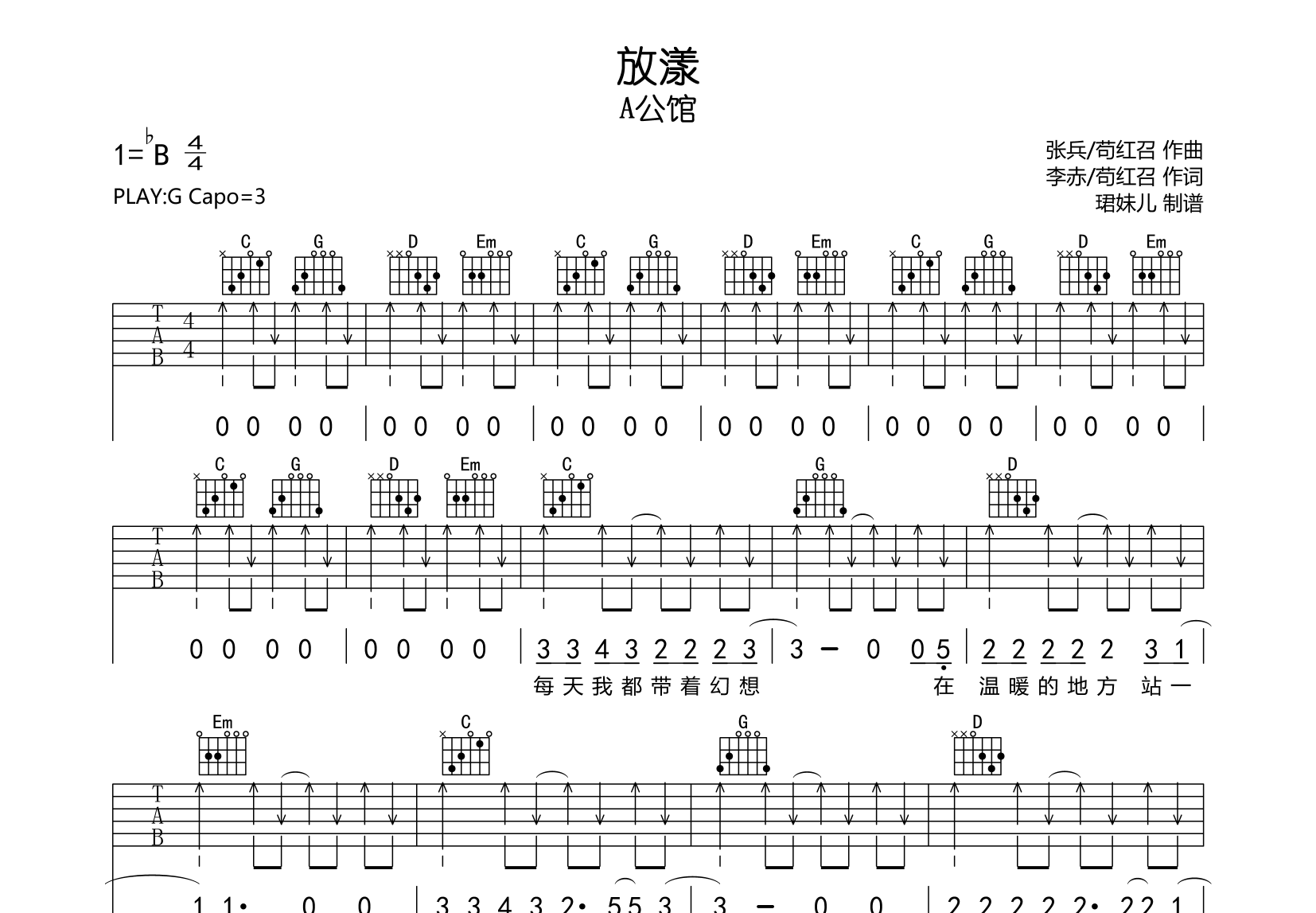曲谱介绍: 《放漾》吉他谱,某幻君演唱,《放漾》吉他弹唱谱,来自@珺妹儿编配扒谱制作,本吉他谱采用G调和弦指法编配,CAPO推荐夹3品,也可以根据个人嗓音条件灵活选择变调夹位置,演奏的速度控制在每分钟90拍左右,演奏难度简单。