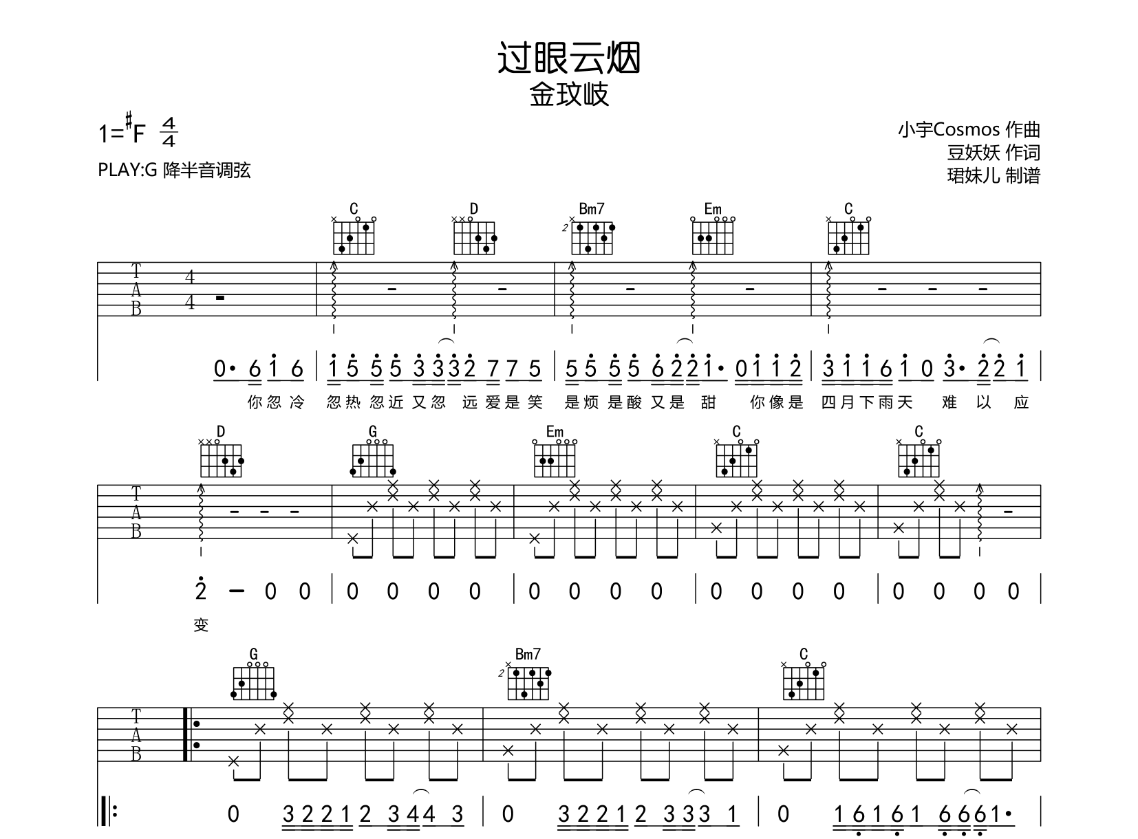 曲谱介绍: 《过眼云烟》吉他谱,金玟岐演唱,《过眼云烟》吉他弹唱谱,来自@珺妹儿编配扒谱制作,本吉他谱采用G调和弦指法编配,需要降半音调弦,演奏的速度控制在每分钟85拍左右,演奏难度简单。共有2张高清图片谱例。
