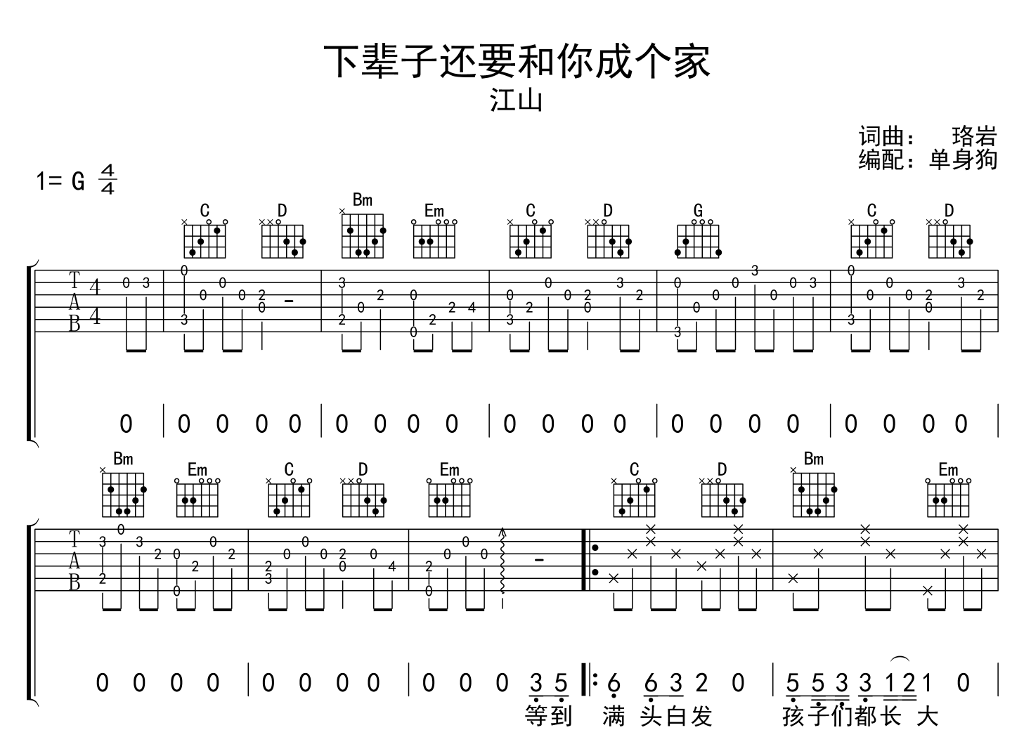 曲谱介绍: 《下辈子还要和你成个家》吉他谱,江山演唱的歌曲,《下辈子还要和你成个家》吉他弹唱谱,来自@单身狗编配扒谱制作,本吉他谱采用G调和弦指法编配,演奏不夹变调夹,原调G调,也可以根据个人嗓音条件灵活选择变调夹位置,演奏的速度控制在每分钟75拍左右,演奏难度简单。