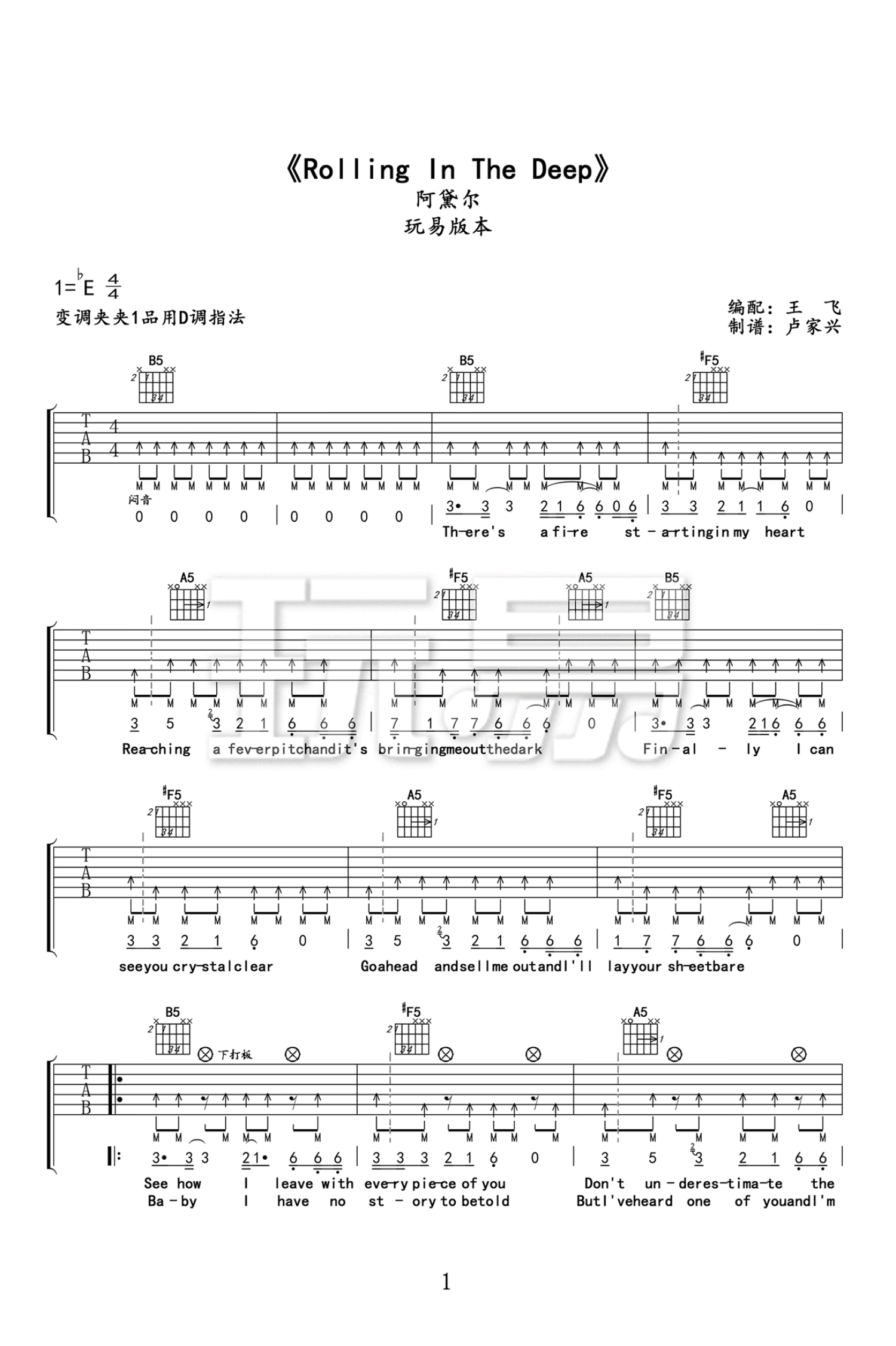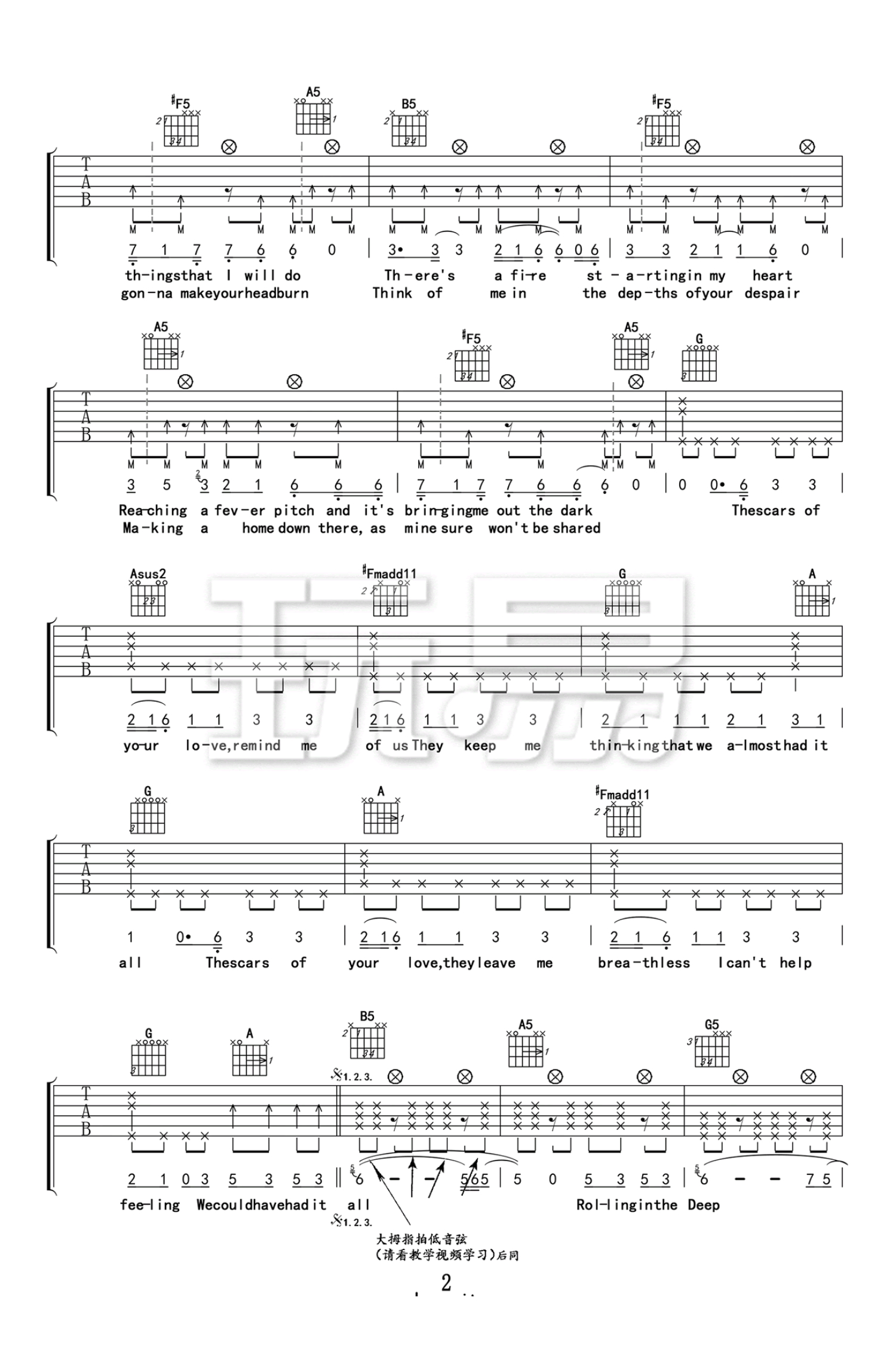 曲谱介绍: rollinginthedeep吉他谱,阿黛尔的经典歌曲,rollinginthedeep六线谱,变调夹夹一品D调指法。《RollingintheDeep》是Adele第二张专辑《21》中的首单,该曲获得了第54届格莱美奖年度歌曲、年度制作、最佳短篇MV三项奖项。在2015纽约城演唱会上,Adele的沧桑跟沙哑的嗓音,在节奏偏快并强调鼓声的作用下,阿呆唱出了对于爱情破碎的挣扎和心碎的看法,而表演中的短暂的笑声又让人感受到这份爱的狂热让她走出了自我阴影。此外,副歌时的现场大合唱也是这次表演的一大亮点!#p#副标题#e#rollinginthedeep吉他谱,本页为曲谱的后两张图片谱例。Adele的歌可以让我安静的凝视自己,从此寂寞孤单心事思念决绝释然都可以融化在慢慢流逝的时间里。