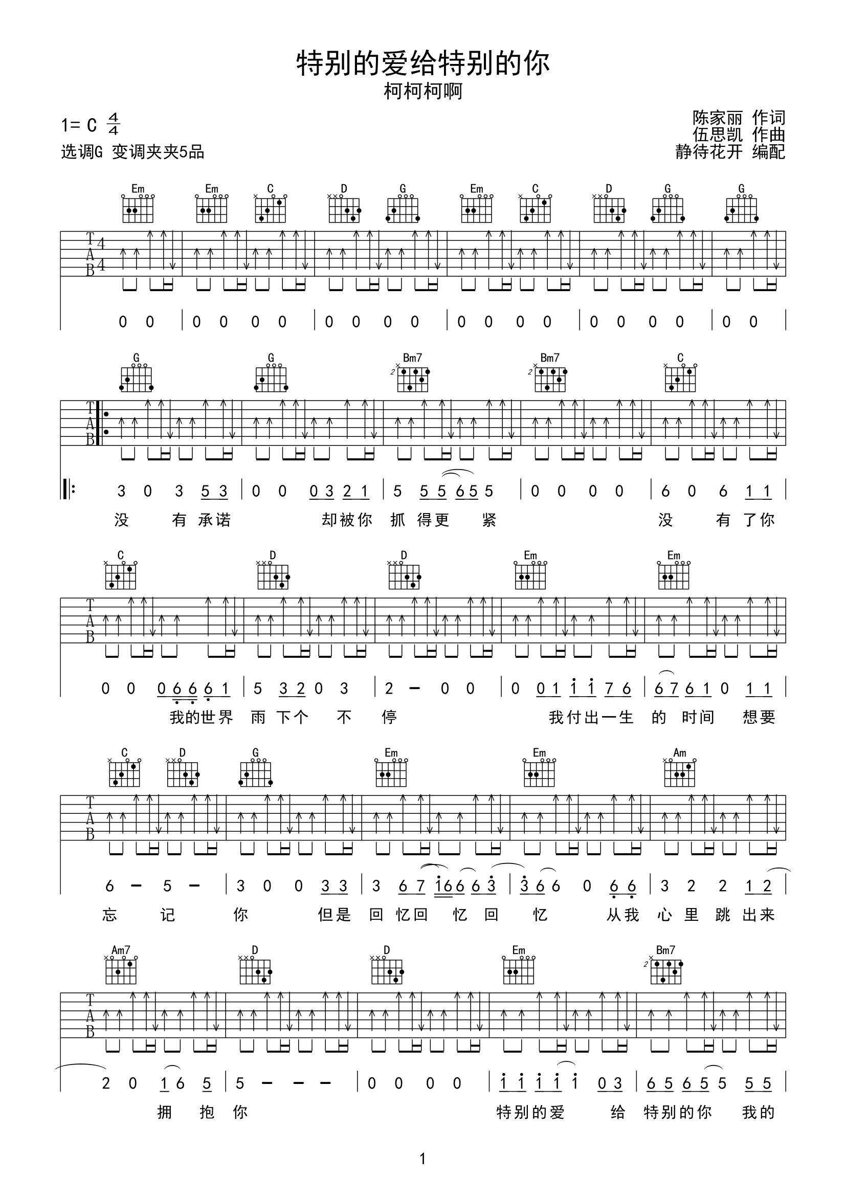 曲谱介绍: 特别的爱给特别的你吉他谱,柯柯柯啊版本,这首伍思凯的经典原唱老歌,重新被网络歌手翻唱,赋予新的流行热度。 《特别的爱给特别的你》吉他六线谱,原调C调,选用G调指法编配,变调夹夹第五品,速度每分钟85拍左右,演奏简单。完整编配共三张图片六线谱。