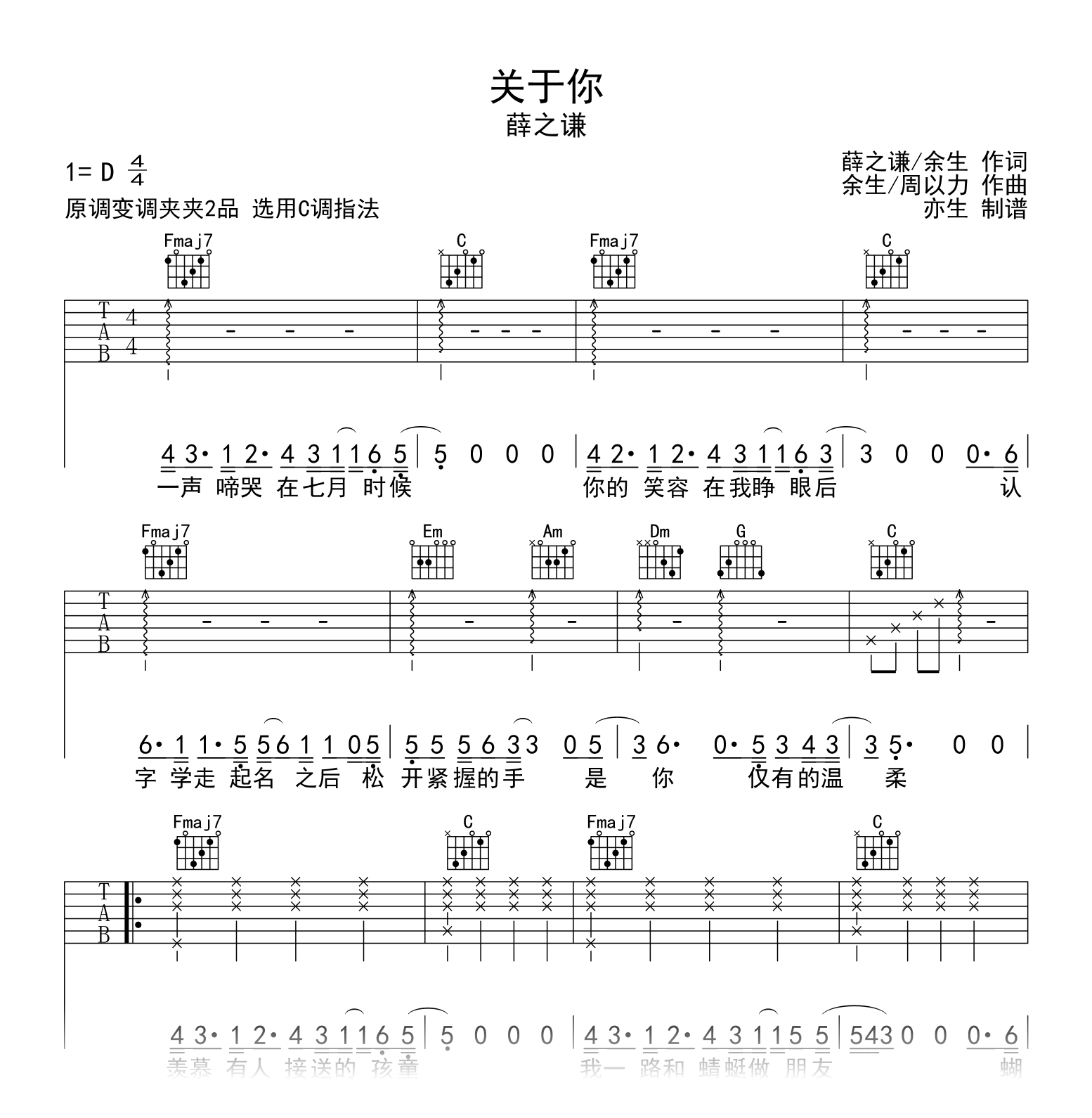 关于你吉他谱 - 薛之谦 - C调吉他弹唱谱