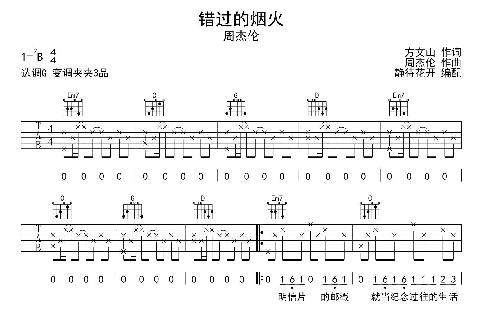 曲谱介绍: 错过的烟火吉他谱,周杰伦演唱,《错过的烟火》吉他弹唱谱,自@静待花开编配扒谱制作,本吉他谱采用G调和弦指法编配,推荐变调夹夹第3品演奏,原调bB调,也可以根据个人嗓音条件灵活选择变调夹位置,演奏的速度控制在每分钟80拍左右,演奏难度简单。