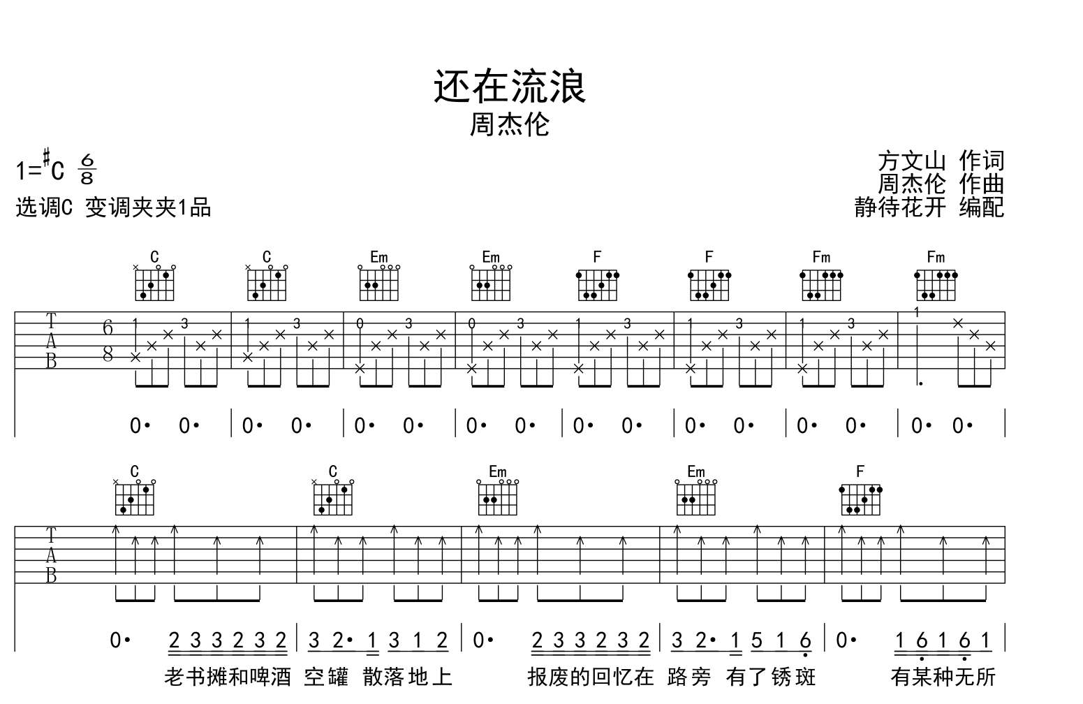 曲谱介绍: 还在流浪吉他谱,周杰伦演唱,《还在流浪》吉他弹唱谱,来自@静待花开编配扒谱制作,本吉他谱采用C调和弦指法编配,推荐变调夹夹第1品演奏,原调#C调,也可以根据个人嗓音条件灵活选择变调夹位置,演奏的速度控制在每分钟拍80左右,演奏难度简单