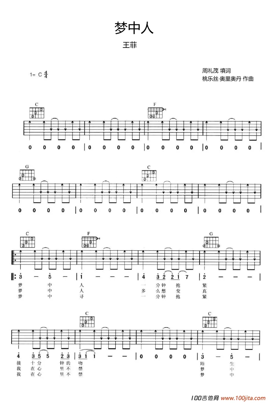 曲谱介绍: 梦中人吉他谱C调编配。两张图片六线谱。这首歌曲也是电影《重庆森林》的主题曲,喜欢的朋友弹唱一下哦,王菲的歌曲柔情万种。这首歌曲也是写出了梦中那个常思念的人。
