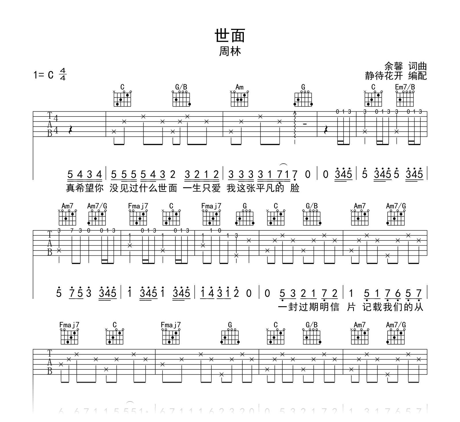 曲谱介绍: 世面吉他谱,周林的一首温柔情歌,《世面》吉他弹唱,采用原调C调指法编配,不夹变调夹,演奏的速度控制在每分钟80拍左右,演奏难度简单。