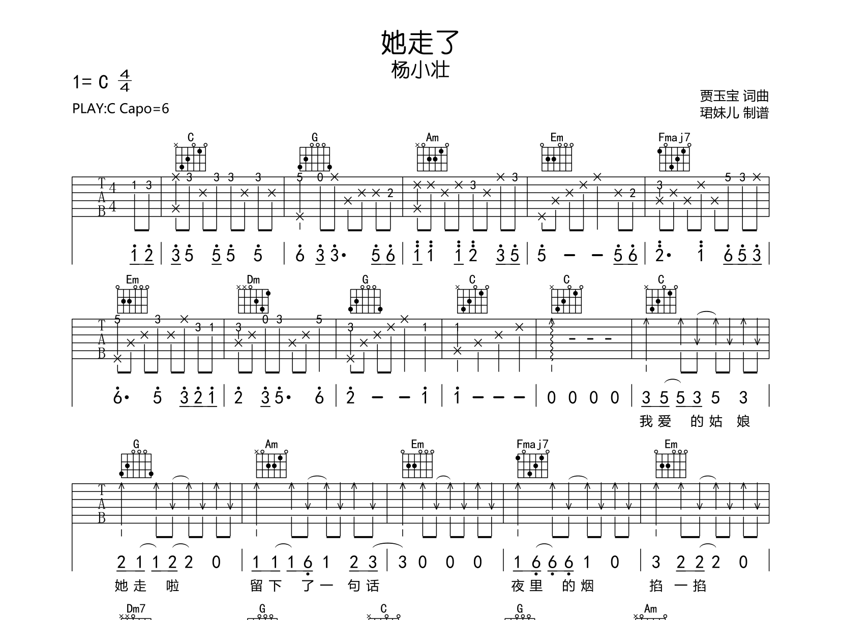 曲谱介绍: 她走了吉他谱,杨小壮演唱,《 她走了》吉他弹唱谱,本谱采用C调指法编配,弹唱建议变调夹6品,速度85BPM,节奏4/4拍,难度较简单,易上手,本谱由珺妹儿制谱,共3张高清图片谱例。