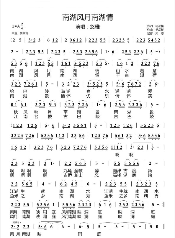 当前位置:琴谱网>吉他弹唱>南湖风月南湖情 A调