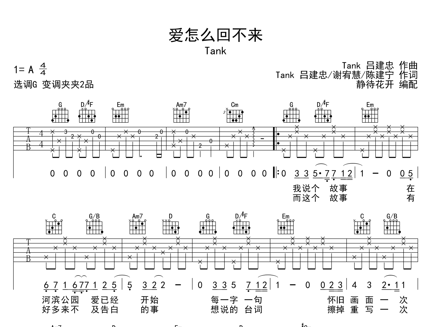 曲谱介绍: 爱怎么回不来吉他谱,TANK久违的一首新歌,《爱怎么回不来》吉他弹唱谱,来自@静待花开编配扒谱制作,本吉他谱采用G调和弦指法编配,推荐变调夹夹第2品演奏,原调A调,也可以根据个人嗓音条件灵活选择变调夹位置,演奏的速度控制在每分钟80拍左右,演奏难度简单,共有2张高清图片谱。