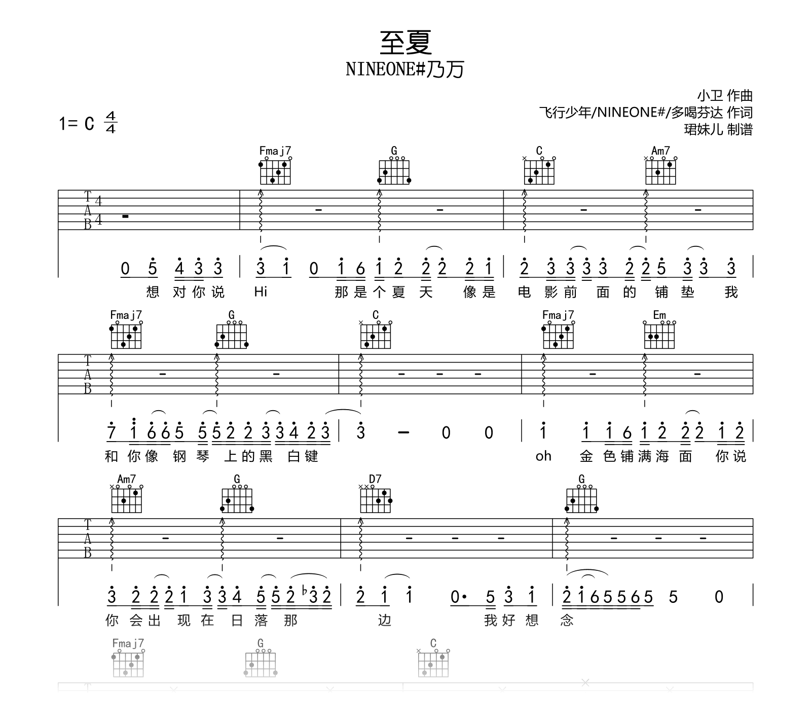 曲谱介绍: 至夏吉他谱,NINEONE#乃万赵馨玥演唱,《至夏》吉他弹唱谱,采用C调指法编配,速度85BPM,演奏难度较简单易上手。完整高清图片谱共三张谱例。
