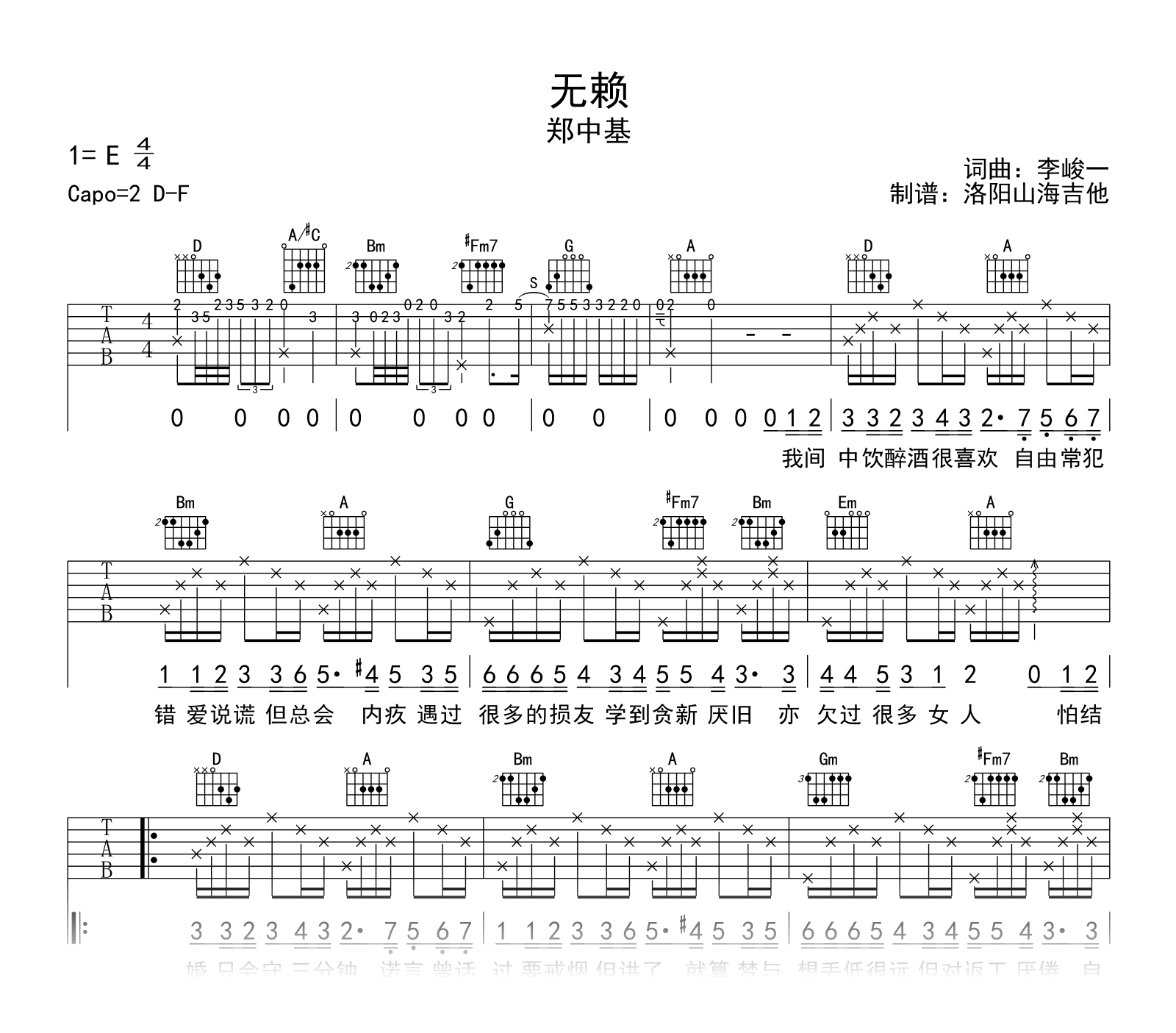曲谱介绍: 无赖吉他谱,郑中基的一首经典粤语老歌,讲述的是这位无赖遇到对的人,然后不断改正自我的故事。《无赖》吉他弹唱谱,原调E,选用D-F调,Capo夹二品,六线谱共两张高清图片谱例。