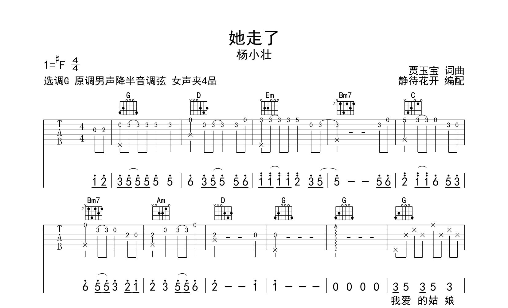 曲谱介绍: 她走了吉他谱,杨小壮演唱,《她走了》吉他弹唱谱,来自@静待花开编配扒谱制作,本吉他谱采用G调和弦指法编配,演奏建议男声降半音调弦,女声变调夹夹4品,原调#F调,也可以根据个人嗓音条件灵活选择变调夹位置,演奏的速度控制在每分钟85拍左右,演奏难度简单,共有3张高清图片谱例。
